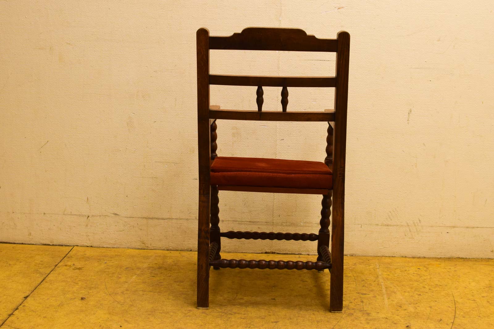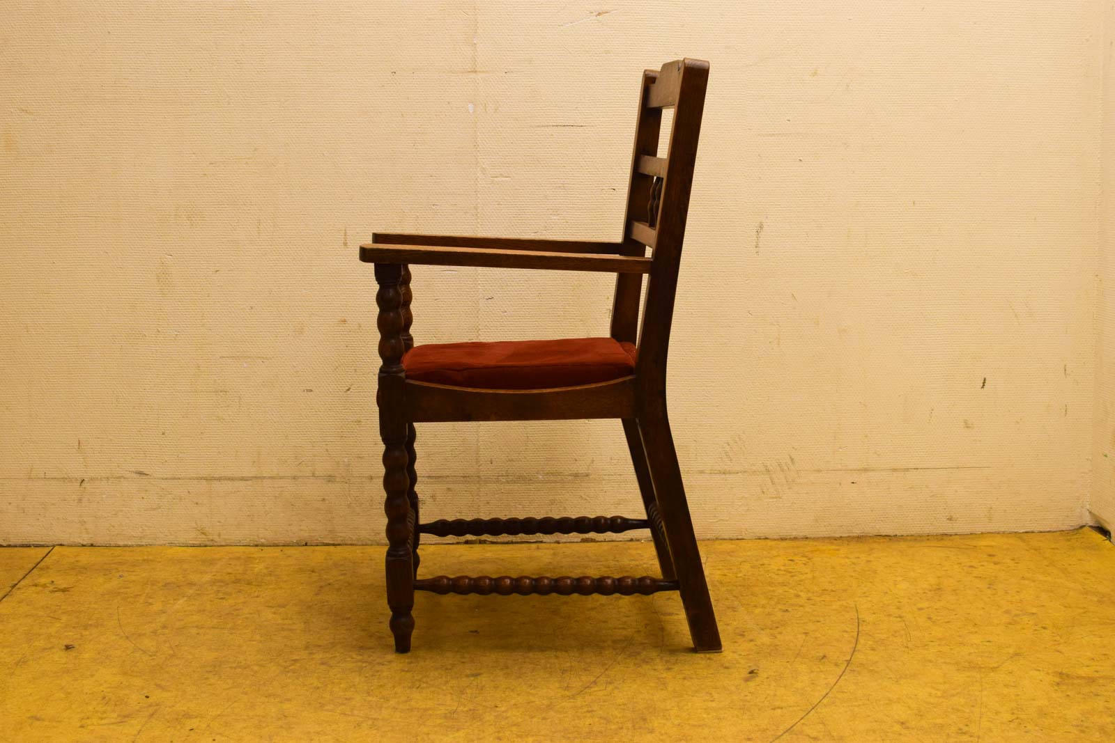 Deze houten eetkamerstoel met armleuningen heeft een stevig geconstrueerde stoel met gedraaide benen en details in de houten rugleuning. De stoel is afgewerkt in een warm donkerbruin hout met fraai vormgegeven armleuningen. Het zitje is bekleed met een terracotta-kleurig stofje dat uitneembaar is, wat handig is voor reiniging of vervangen.