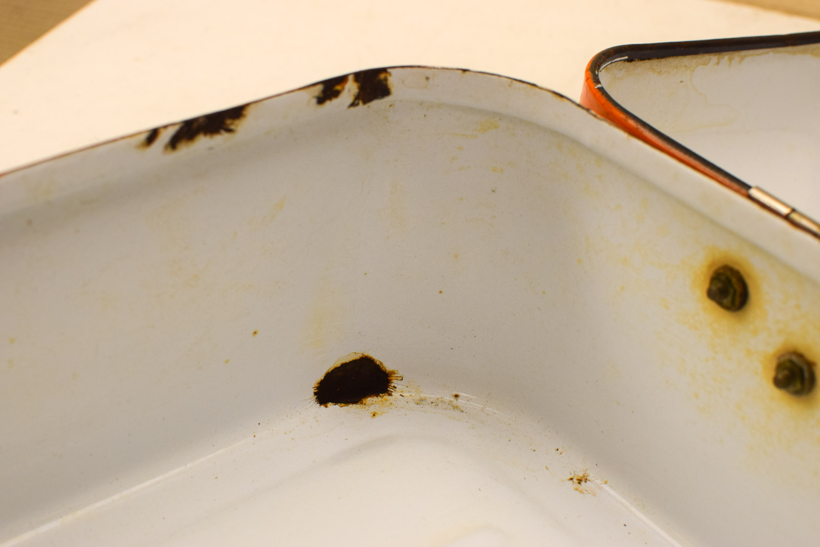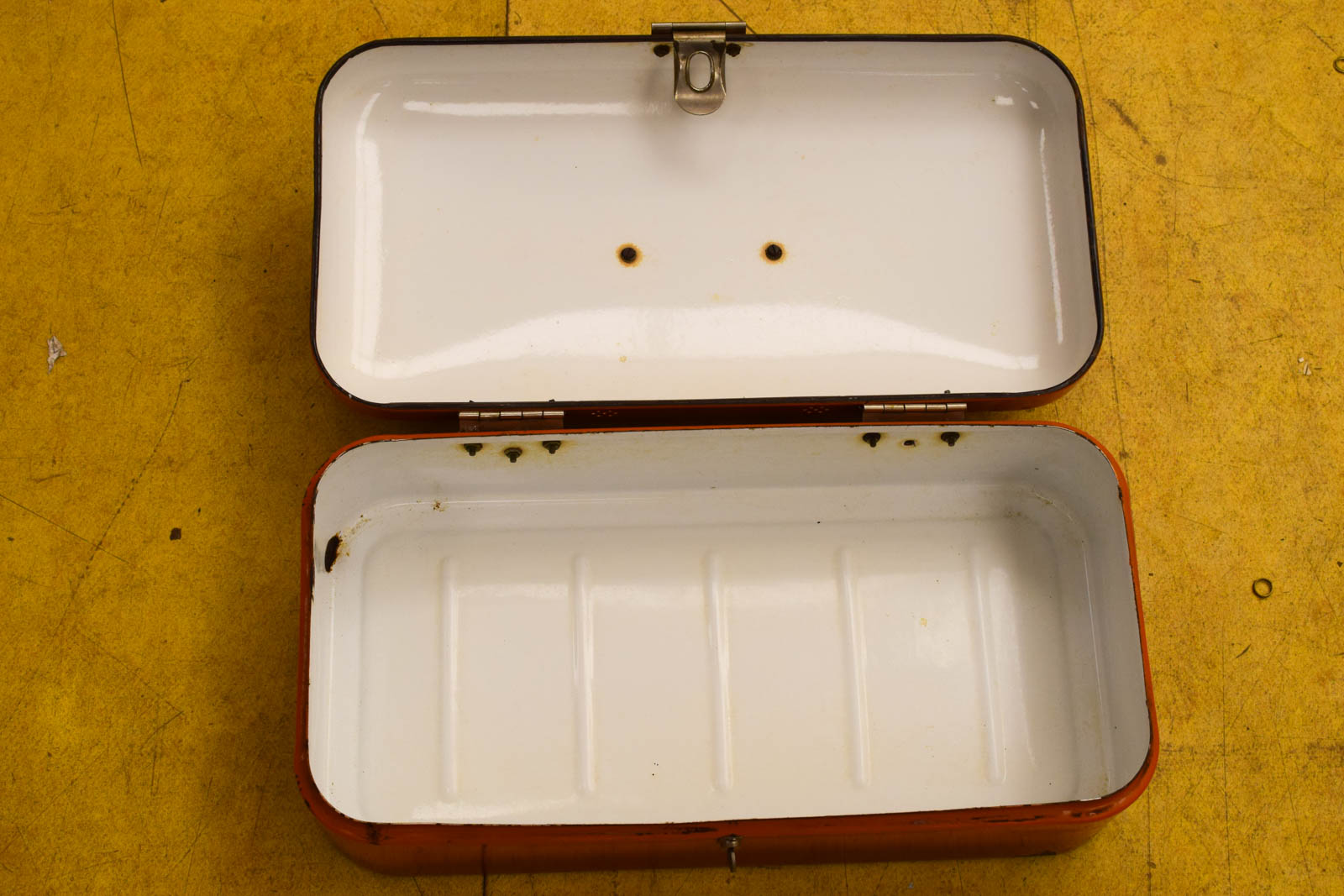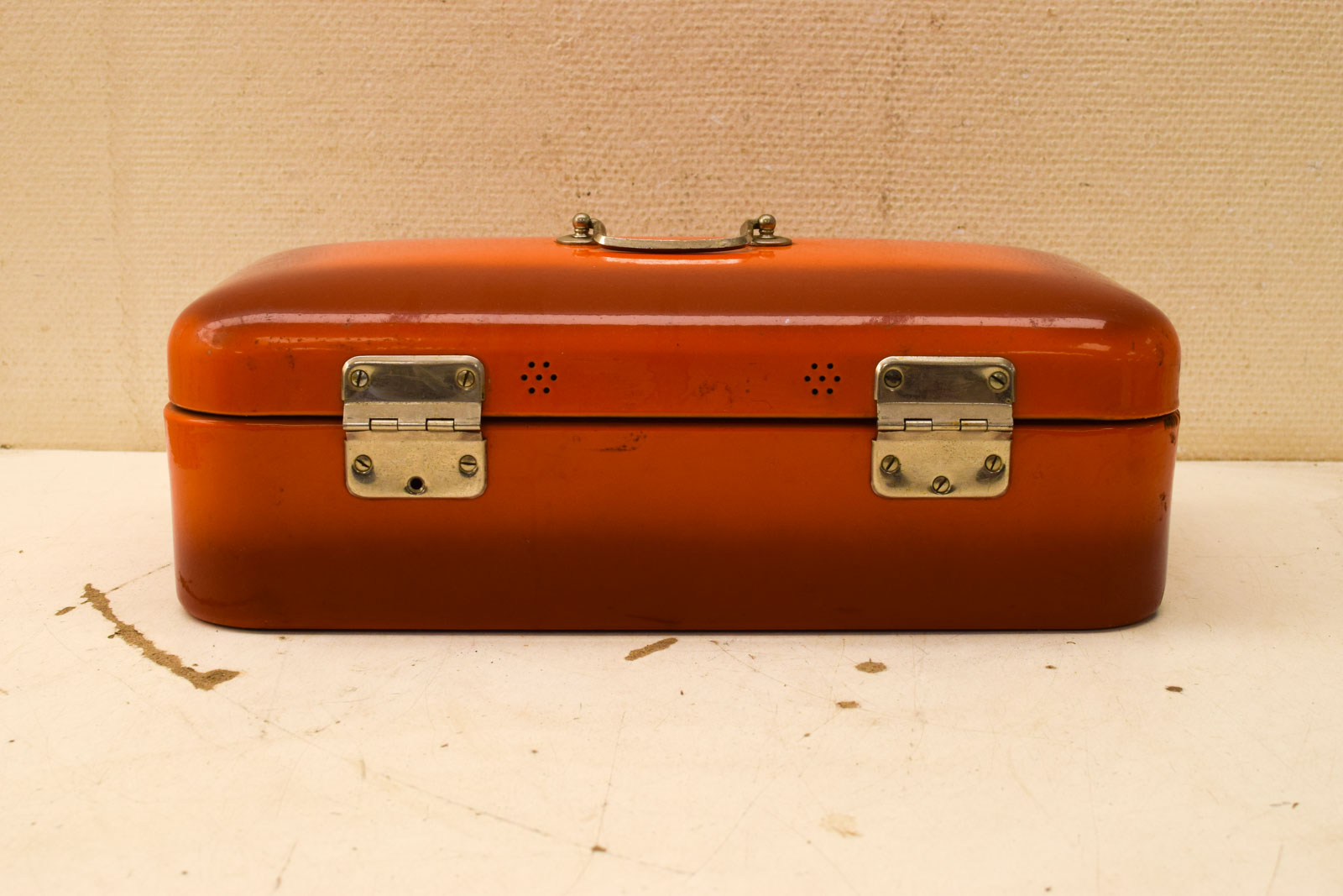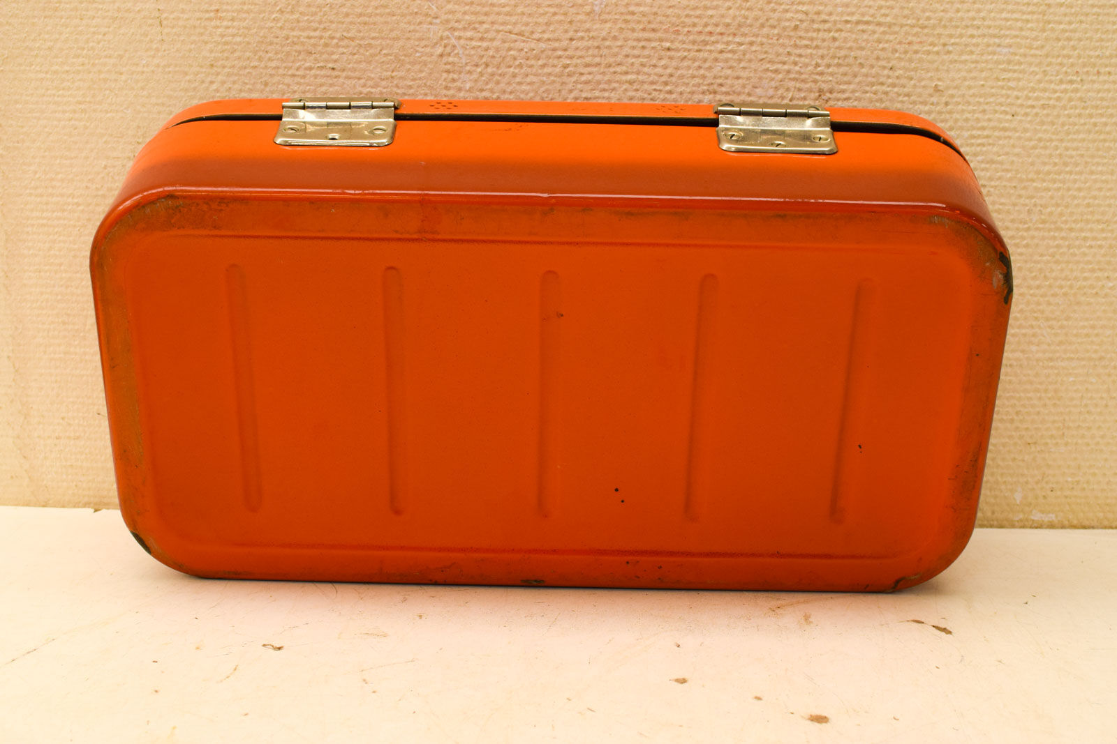 de broodtrommel heeft roestplekjes en krasjes en gebruikssporen binnenmaat 46 diepte 23 cm hoog 11 cm de deksel sluit niet goed