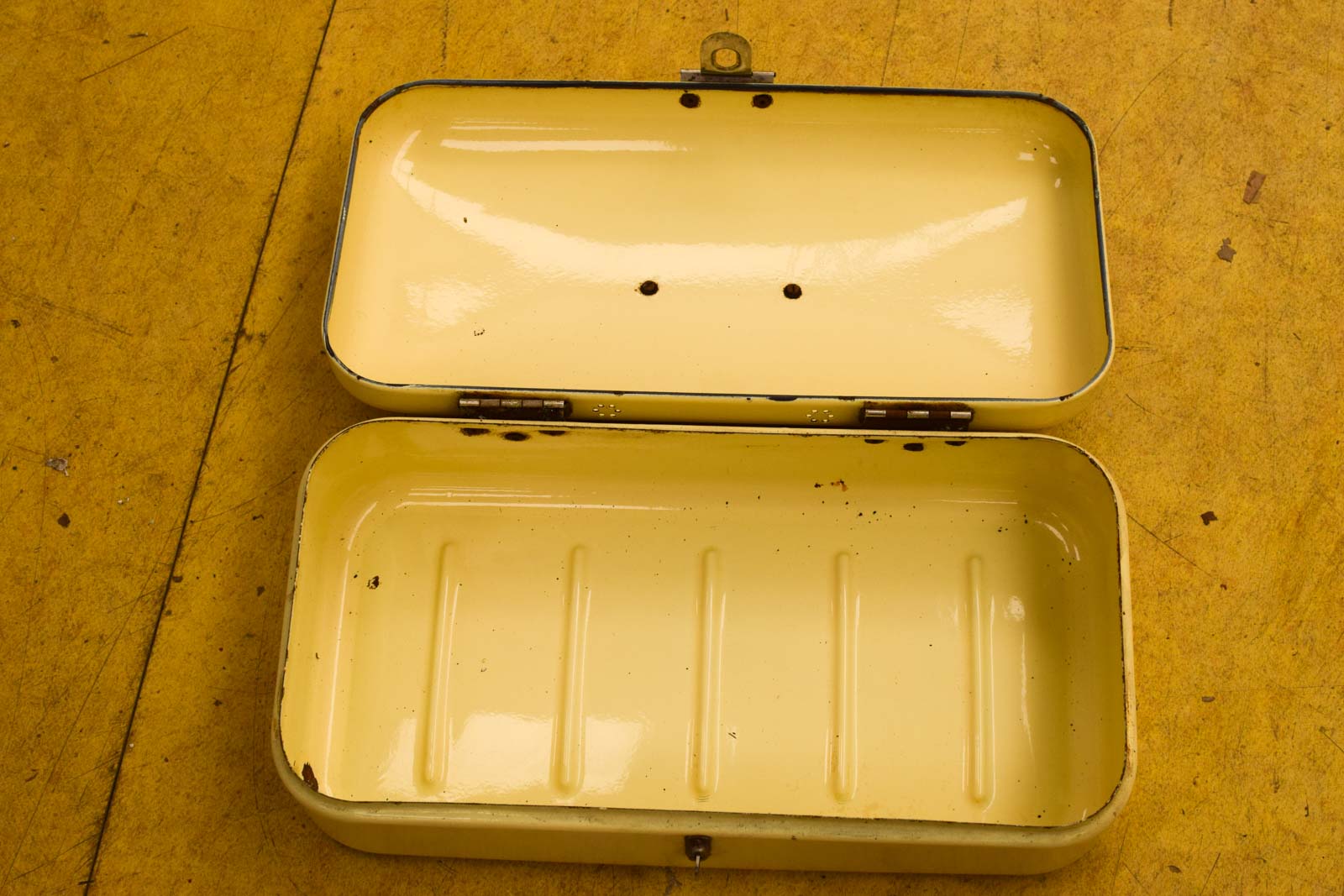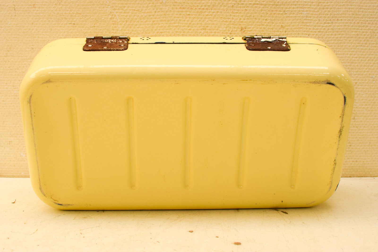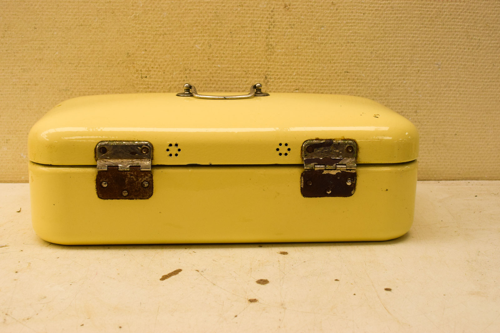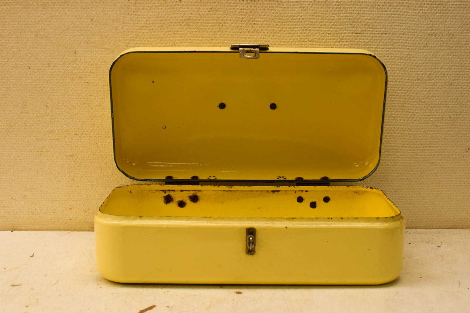 de broodtrommel heeft roestplekken binnenmaat breed 45 cm diepte 22 cm hoog 10,5 cm