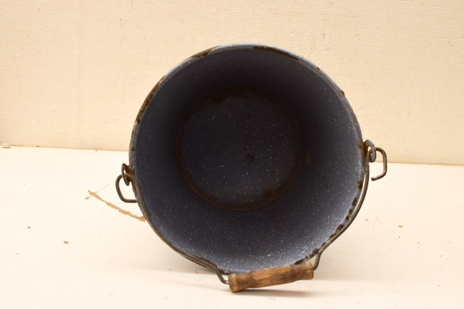 heeft aan slag aan de binnenkant diameter bovenkant opening 29 cm gemeten zonder hendel hoog 27 cm de aardappel emmer is gebruikt heeft gebruikssporen en roest
