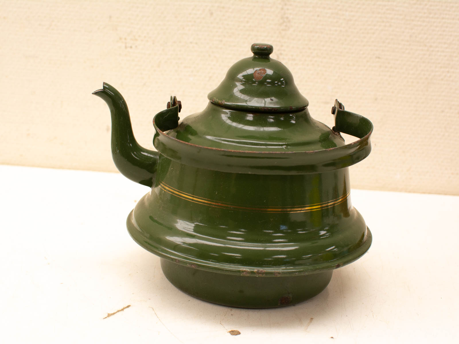 de ketel heeft roestplekjes gemeten van einde hendel tot tuit 22 cm hoogte gemeten zonder deksel 16 cm