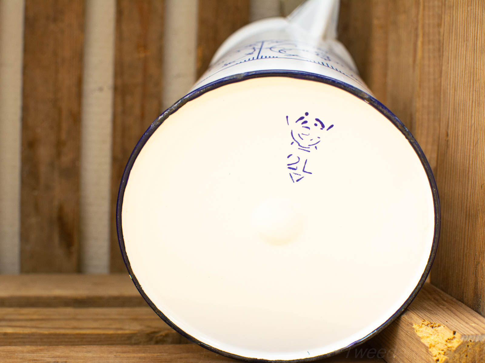 de kan heeft het Blau Saks patroon de kan heeft een blauwe rand de kan heeft een inhoud van 2 liter