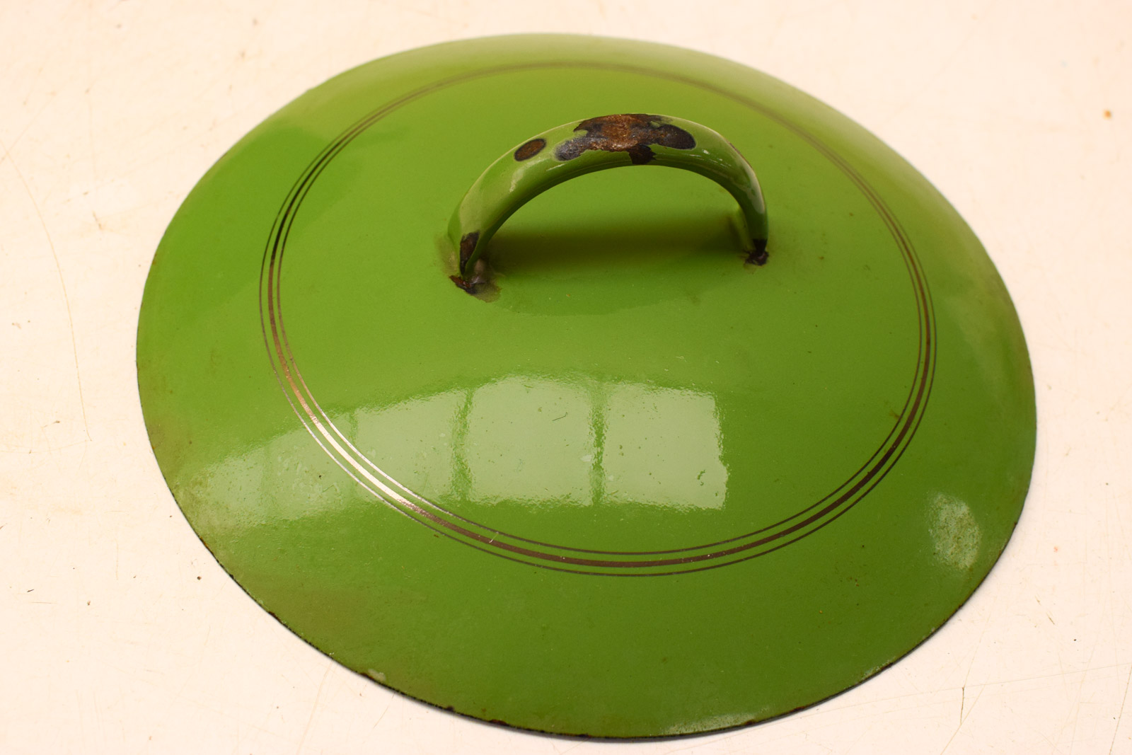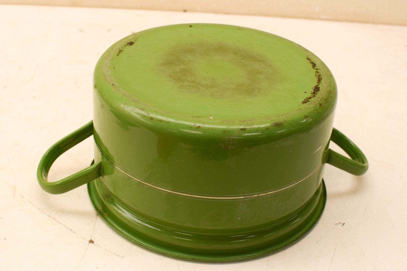 de kookpan heeft roestplekken heeft krassen en lichte aanslag aan de binnenkant de pan is gebruikt gemeten diameter bovenkant opening 26 cm gemeten zonder deksel hoog 14,5 cm