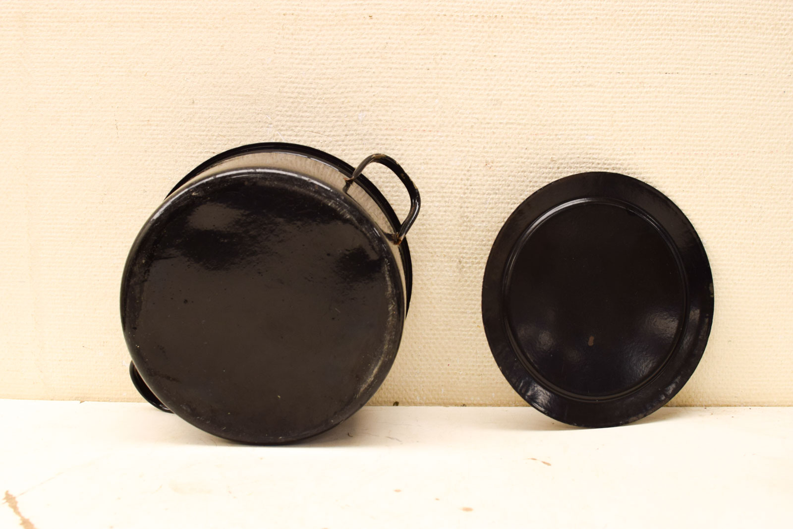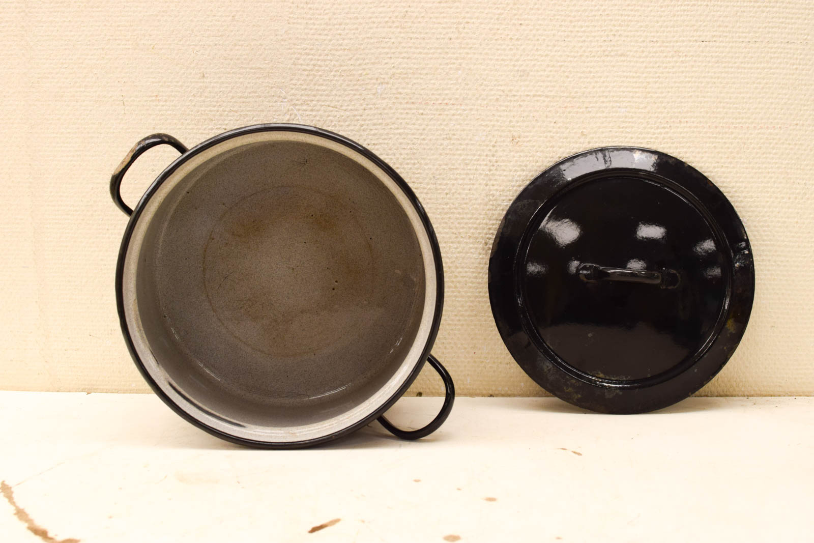 de pan heeft aan de binnenkant krassen en aanslag de pan heeft roestplekken diameter bovenkant opening van de pan 29 cm gemeten zonder deksel hoog 16 cm