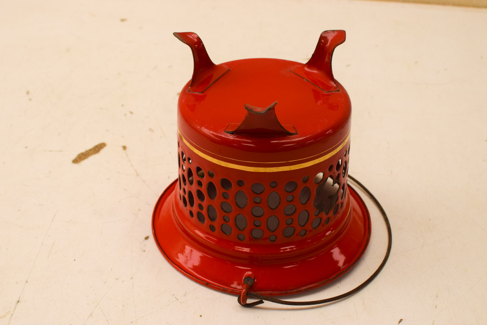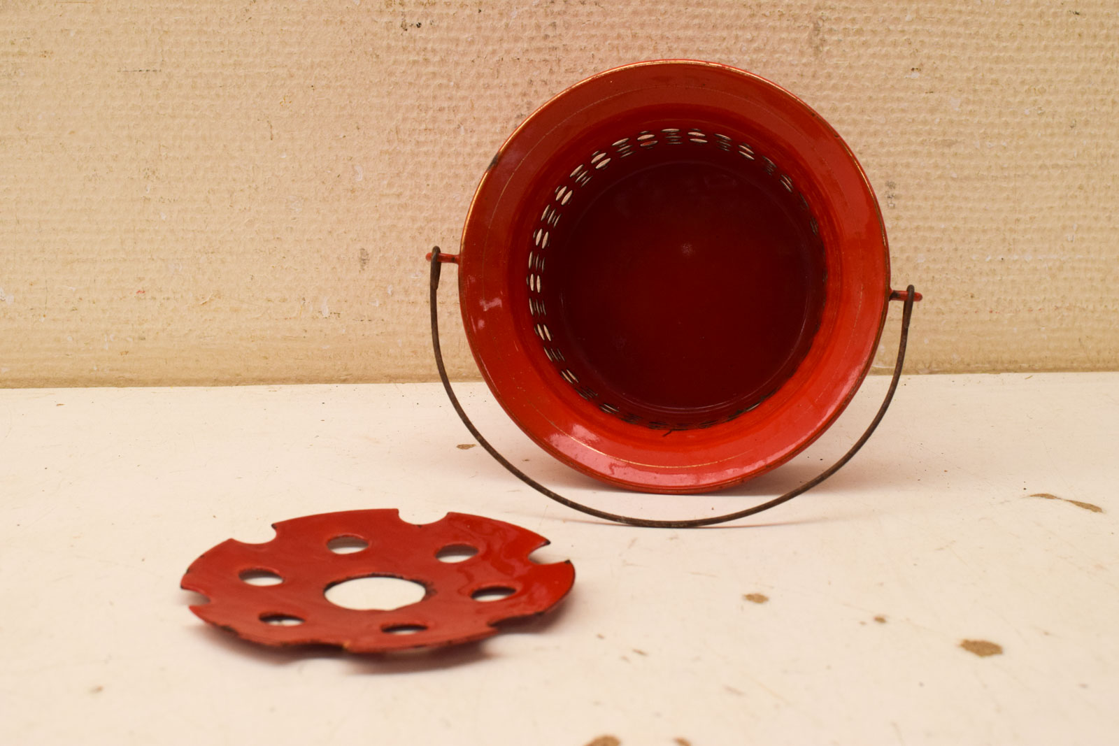 kleur rood/ oranje de kleur wijkt af van de foto diameter bovenkant 16 cm gemeten zonder hendel hoog 14 cm de theelichthouder heeft roest en gebruikssporen
