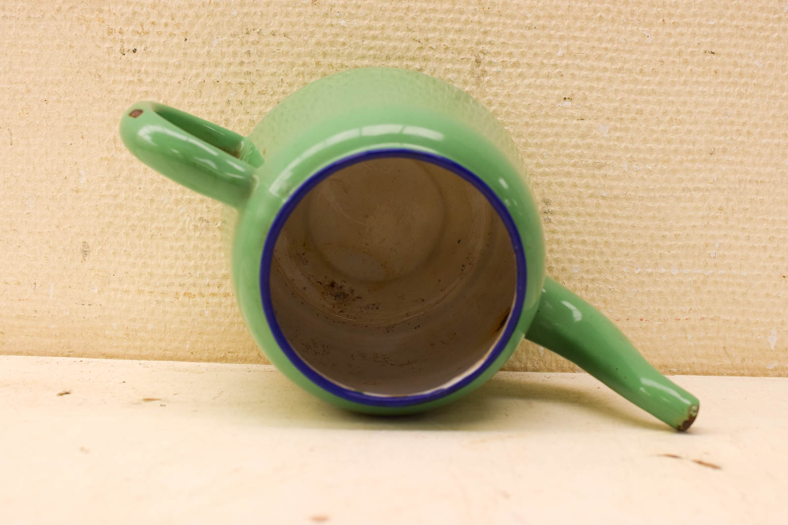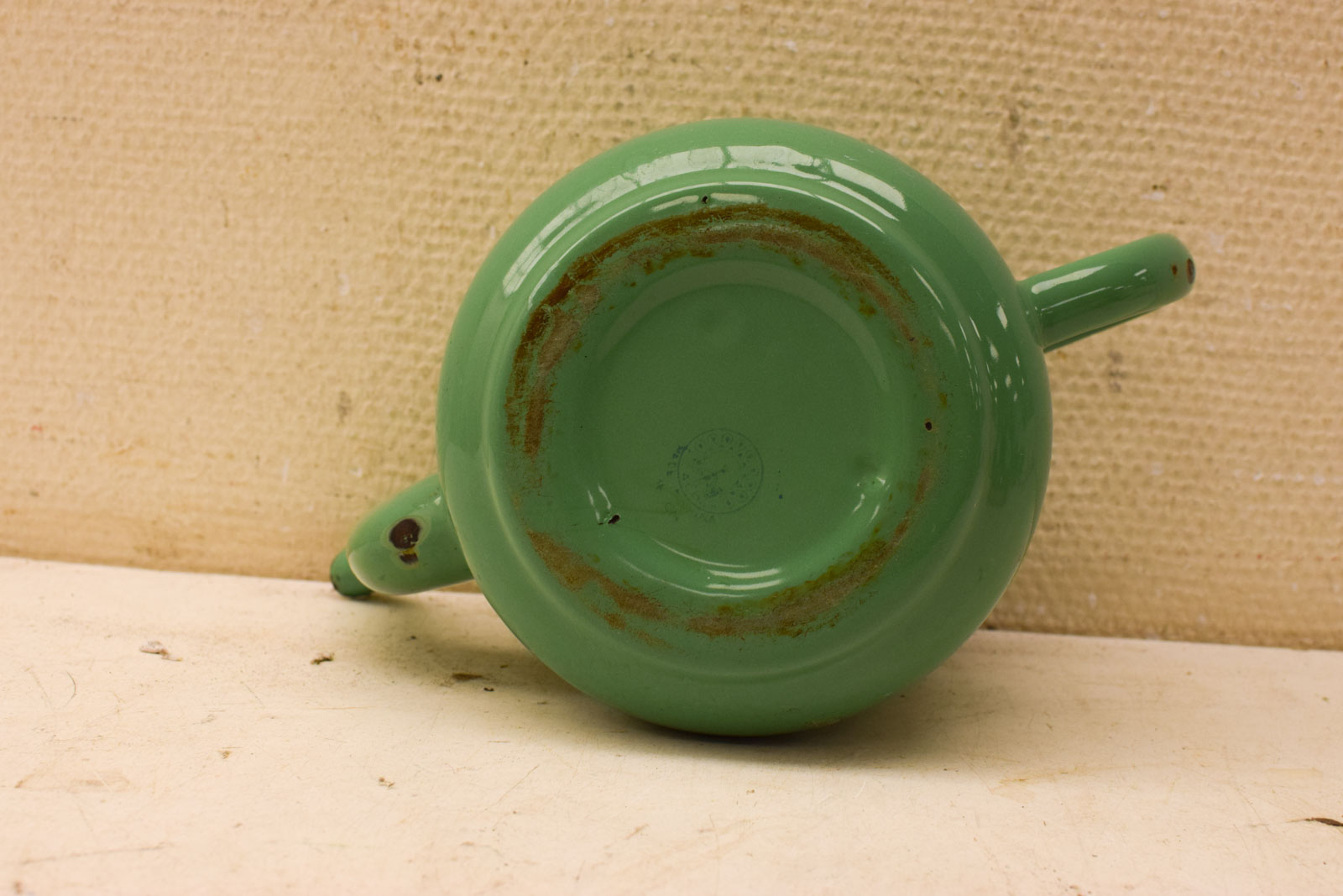 de theepot heeft roestplekjes en heeft aanslag krassen en vlekken aan de binnenkant gemeten van oor tot tuit 26 cm gemeten zonder deksel hoog 16 cm