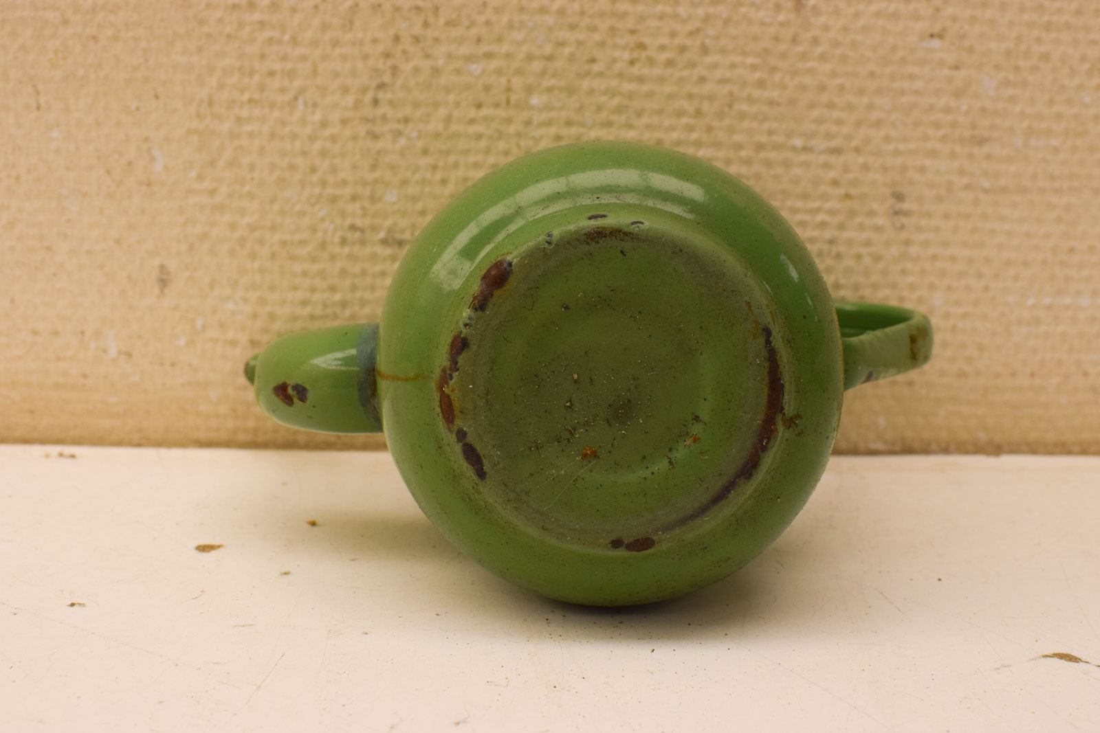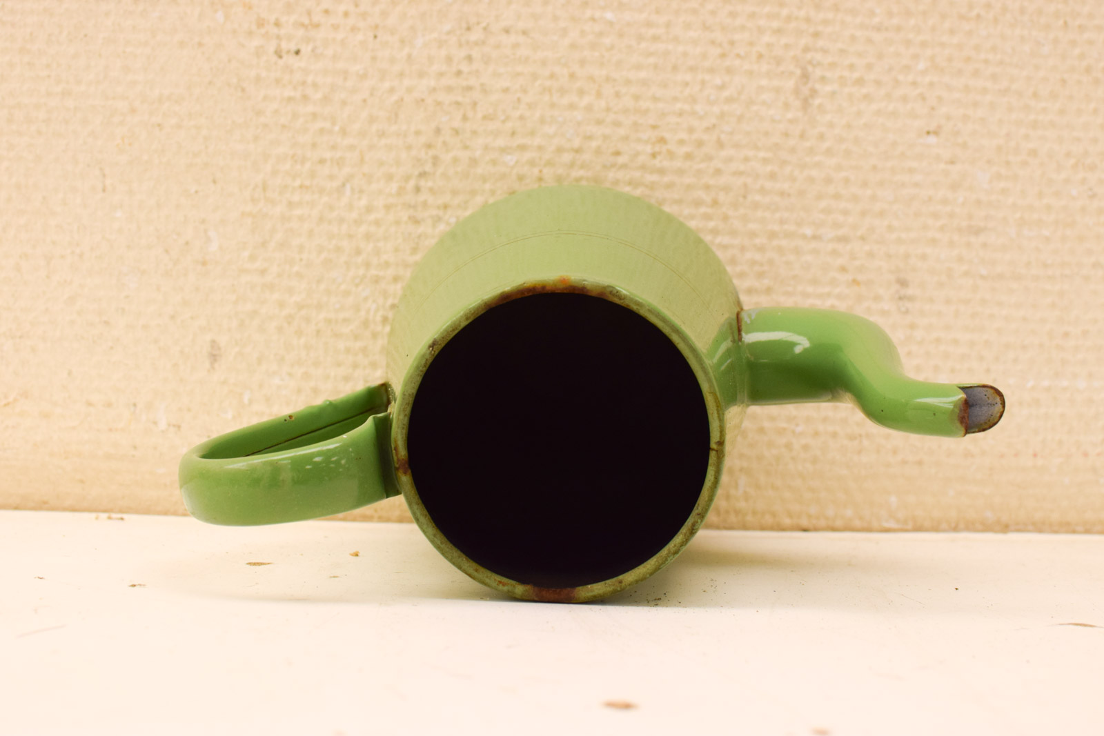 heeft aanslag aan de binnenkant en heeft roest plekken gemeten van tuit met oor 21 cm gemeten zonder deksel hoog 16,5 cm