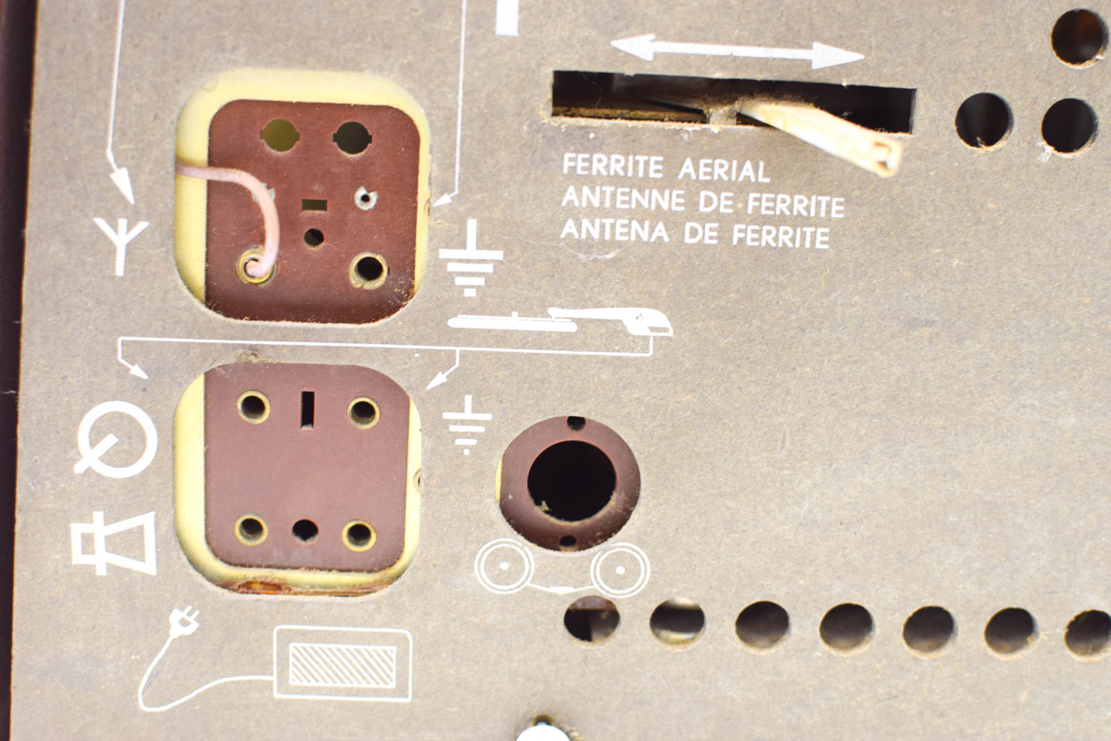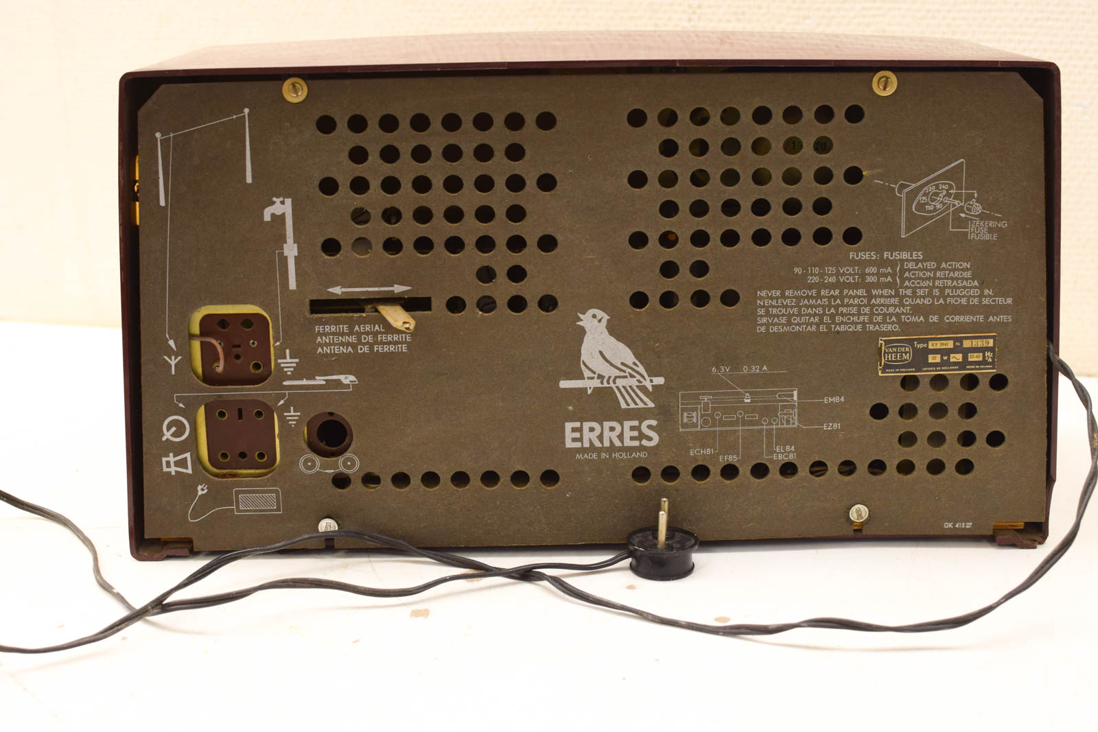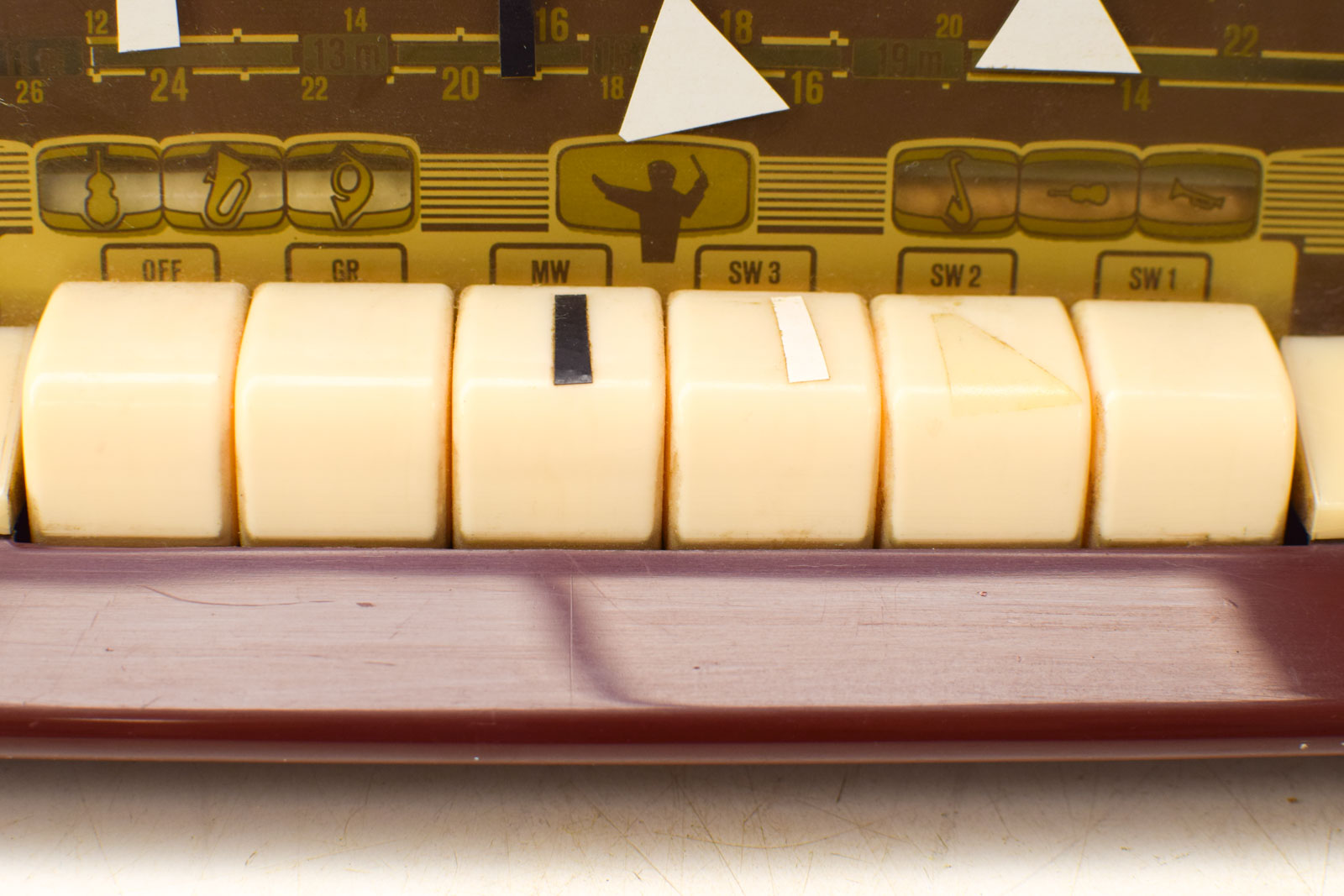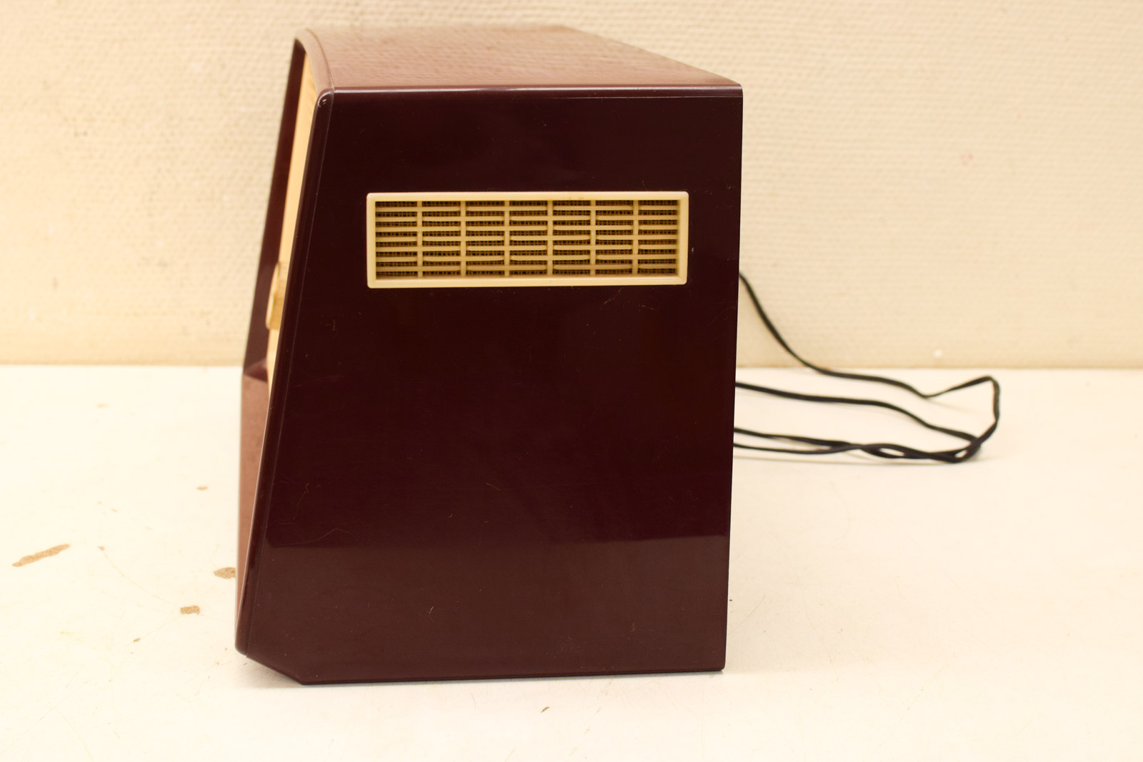 het gaat aan maar we krijgen er geen zender op radio gaat voor loop of sloop breed 45,5 cm diepte 20,5 cm hoog 25 de radio heeft gebruikssporen heeft een aparte kleur rood/bruin