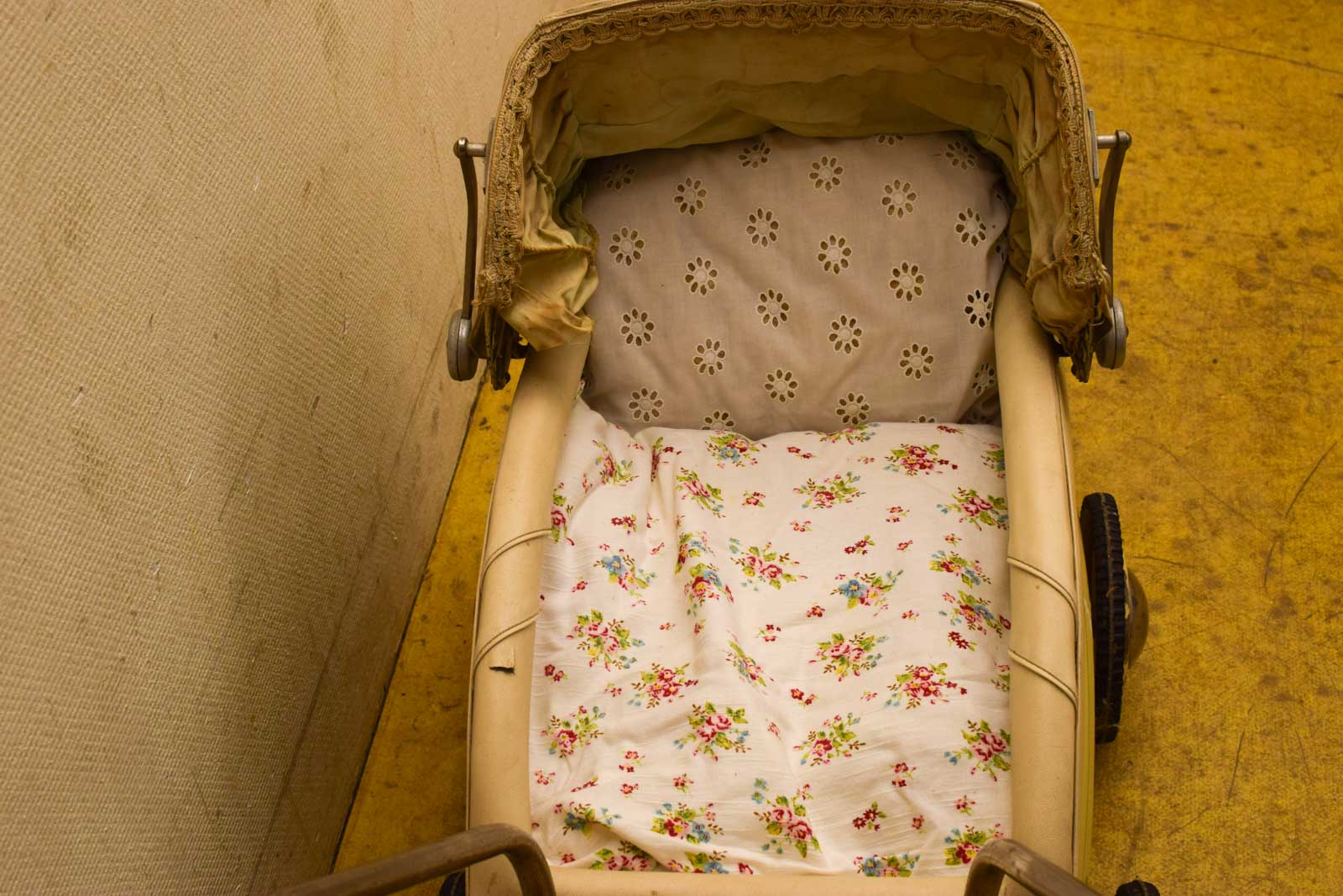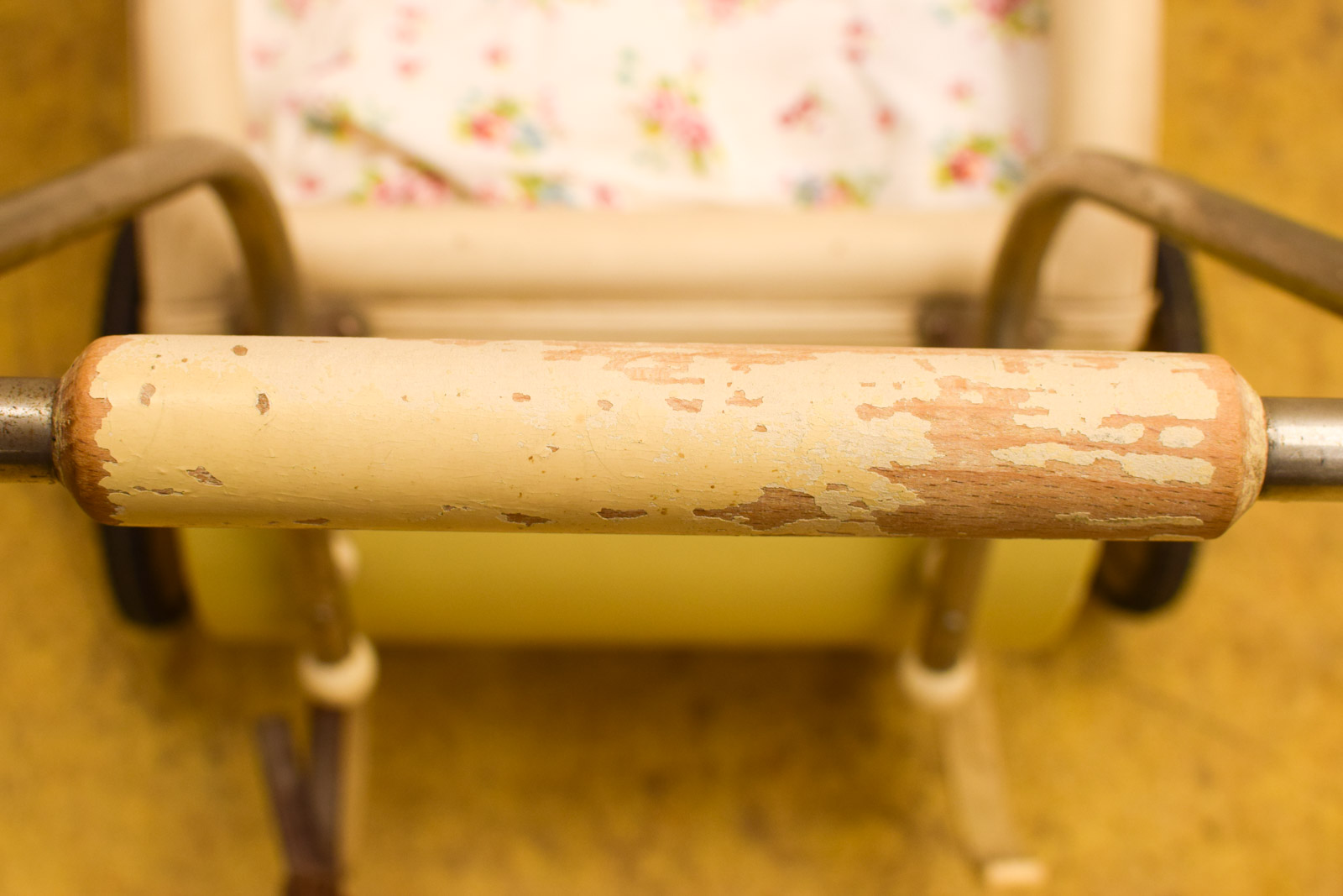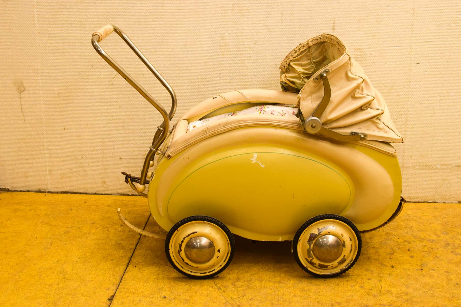 Deze Fasnia poppenwagen is een klassieke vintage kinderwagen in vrolijk geel met creme details. Het is een speelgoed uit een voorbij era, toen zulke wagentjes standaard hoorden bij elk meisje. De wagen is compleet met origineel beddengoed met bloemenpatroon.