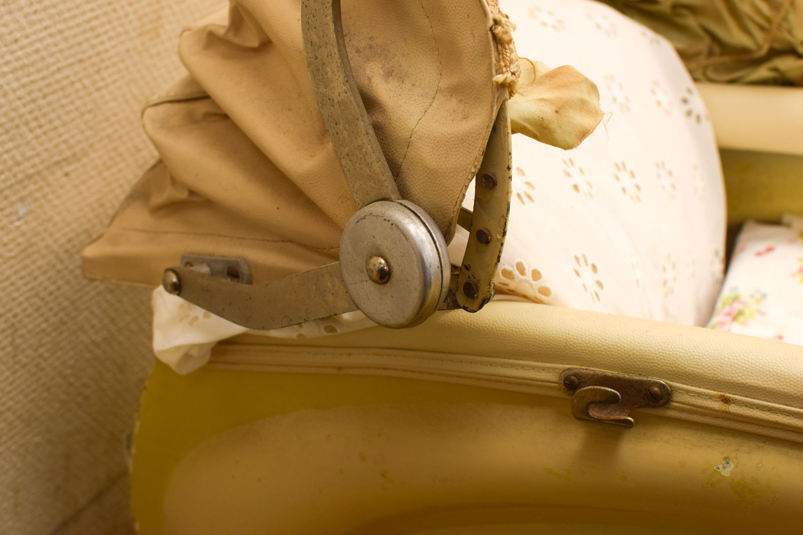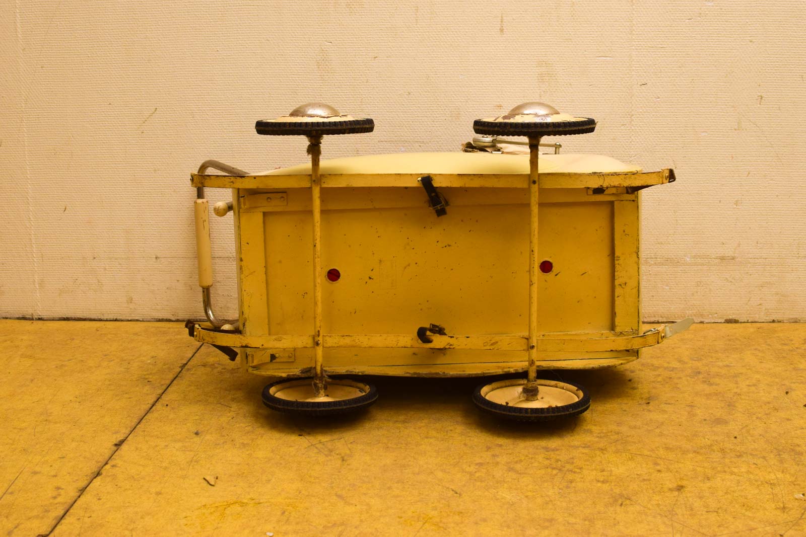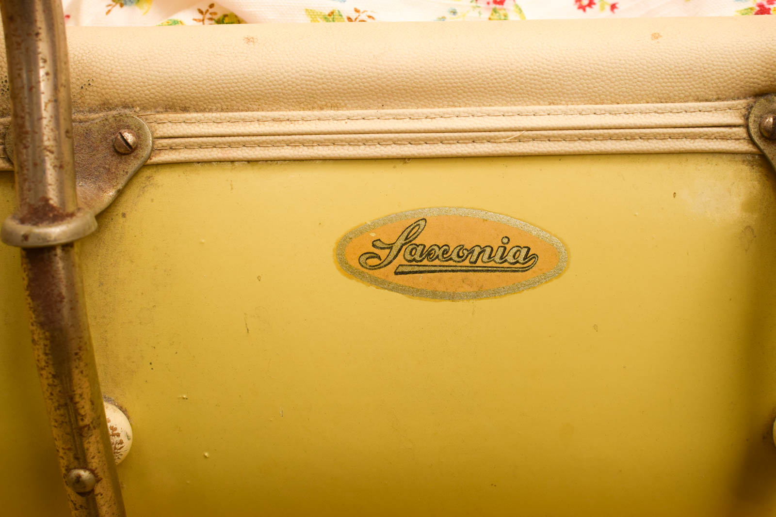 Deze Fasnia poppenwagen is een klassieke vintage kinderwagen in vrolijk geel met creme details. Het is een speelgoed uit een voorbij era, toen zulke wagentjes standaard hoorden bij elk meisje. De wagen is compleet met origineel beddengoed met bloemenpatroon.