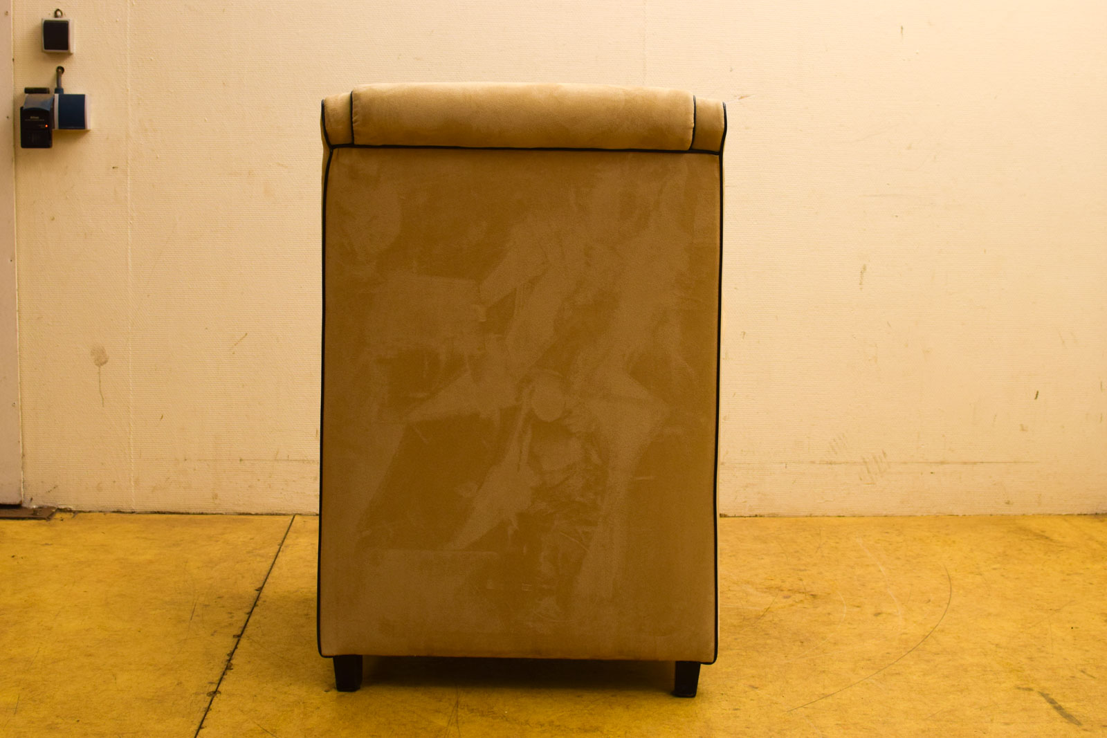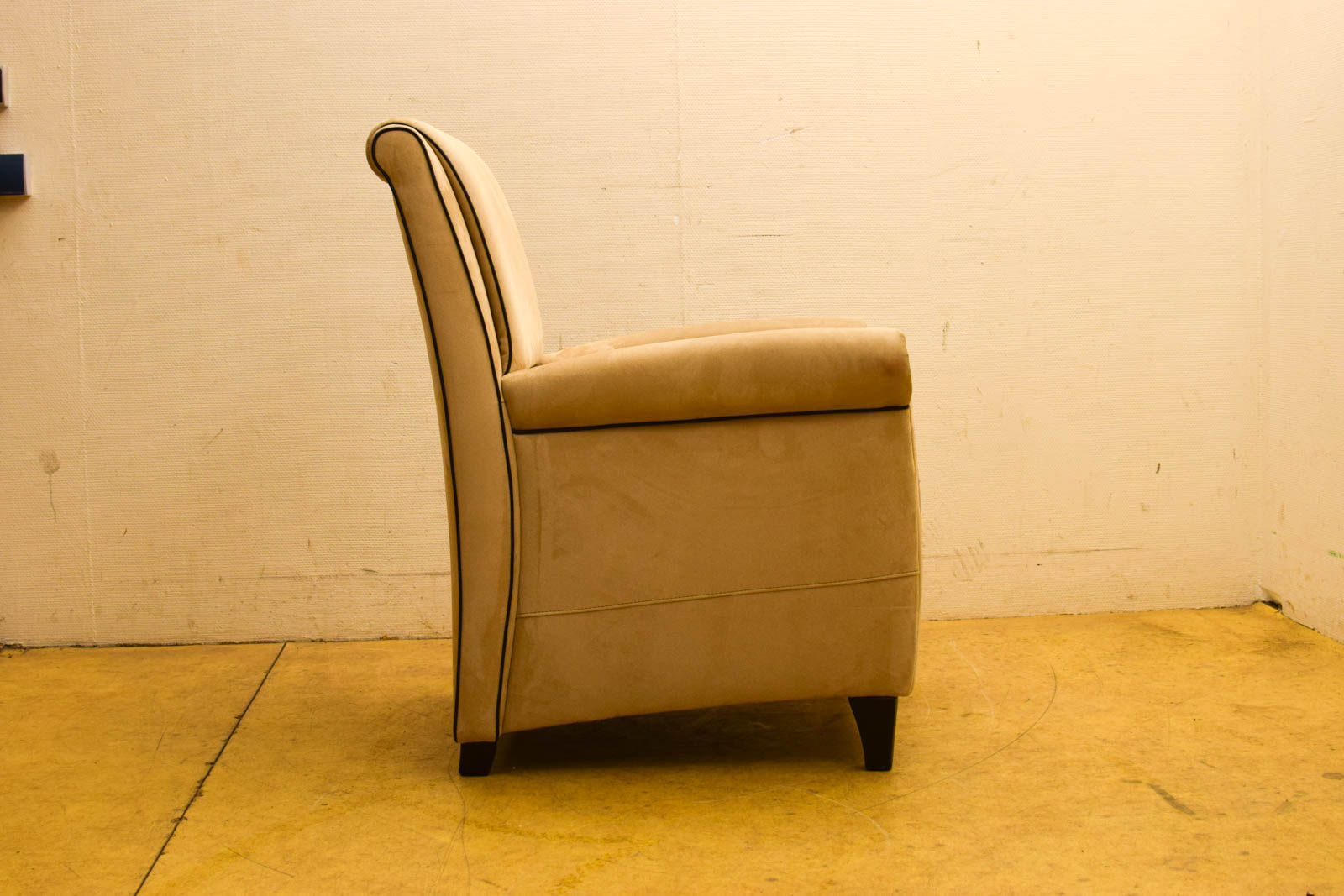 de stof van de Fauteuil is van suede heeft een paar vlekken door het gebruik verder is de Fauteuil redelijk en zit nog goed gemeten met de leunings breed 76 cm