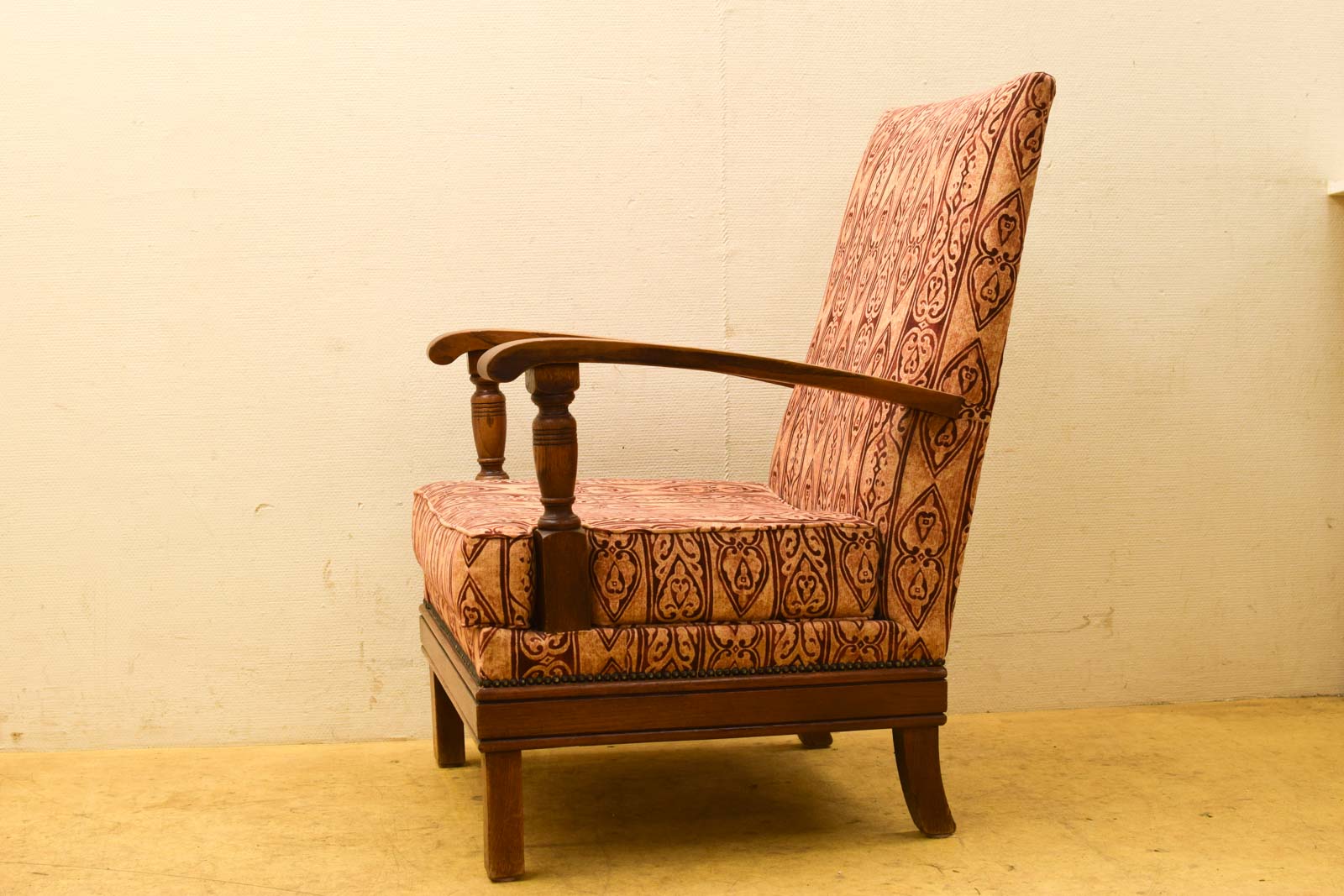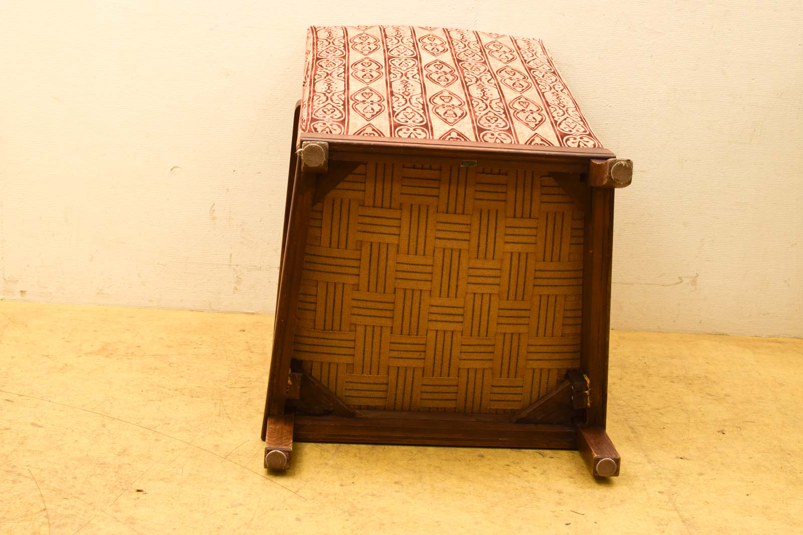 gemeten met leunings breed 68,5 cm zithoogte 43,5 cm het hout heeft verkleuring bij de armleuning het stofje is heel en ziet er nog netjes uit