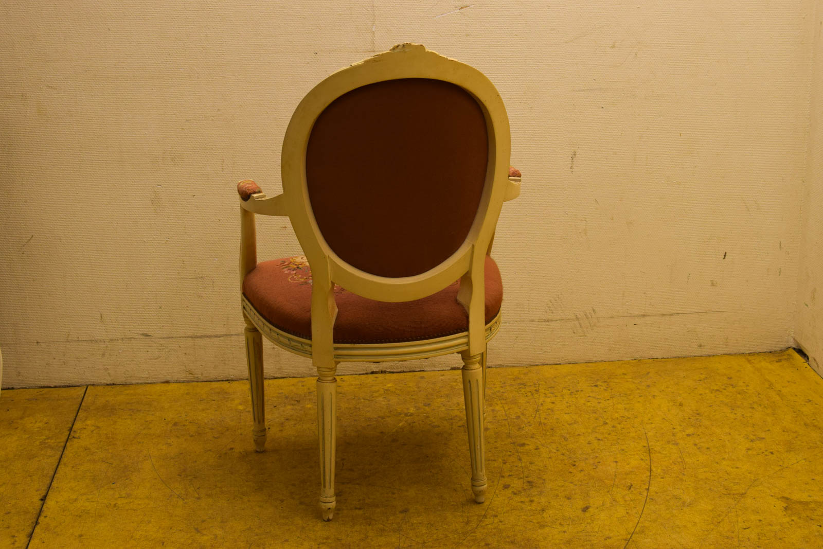 gemeten met leunings breed 61 cm de zitvlak en leuning zijn geborduurd de stoel heeft gebruikssporen maar is nog stevig