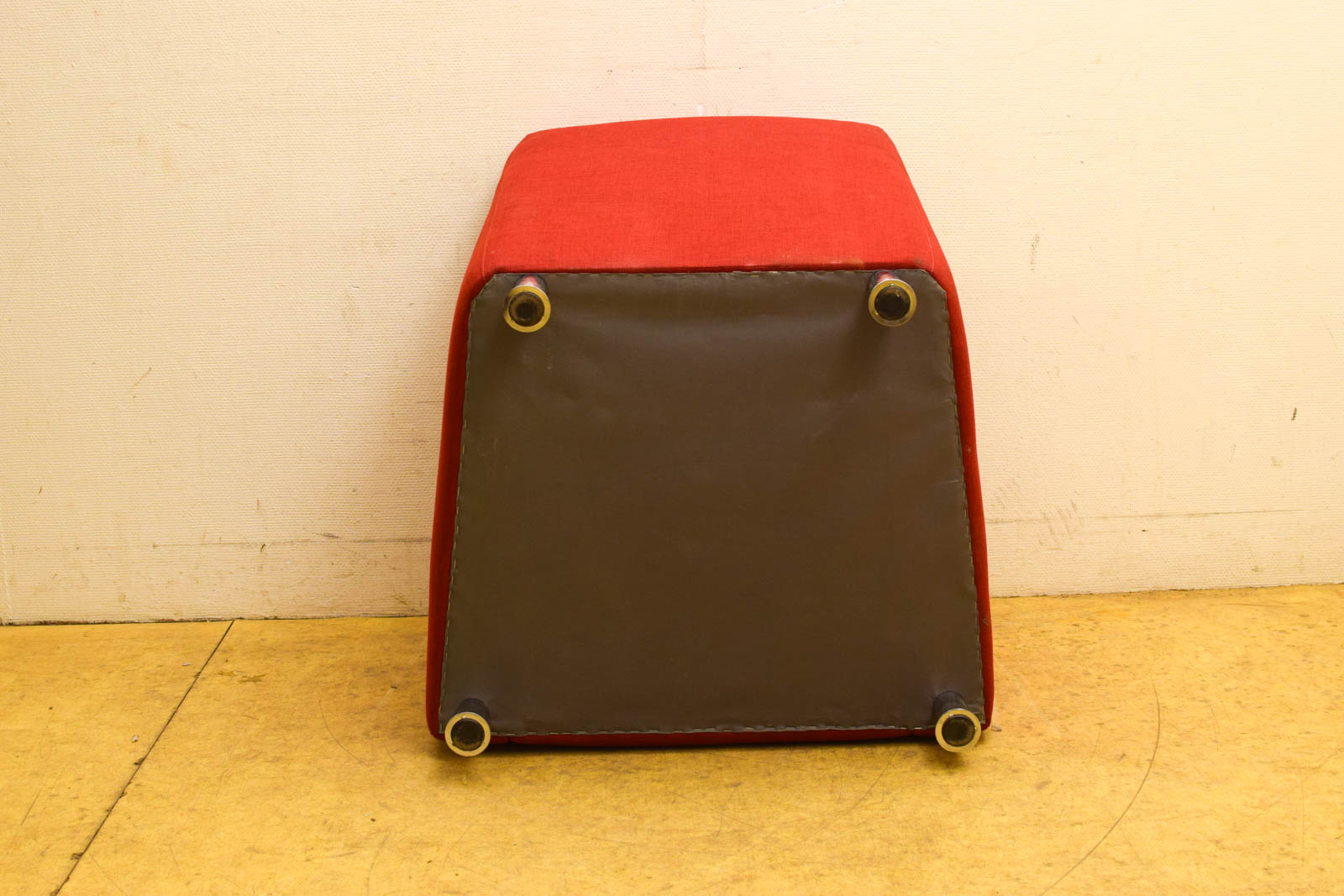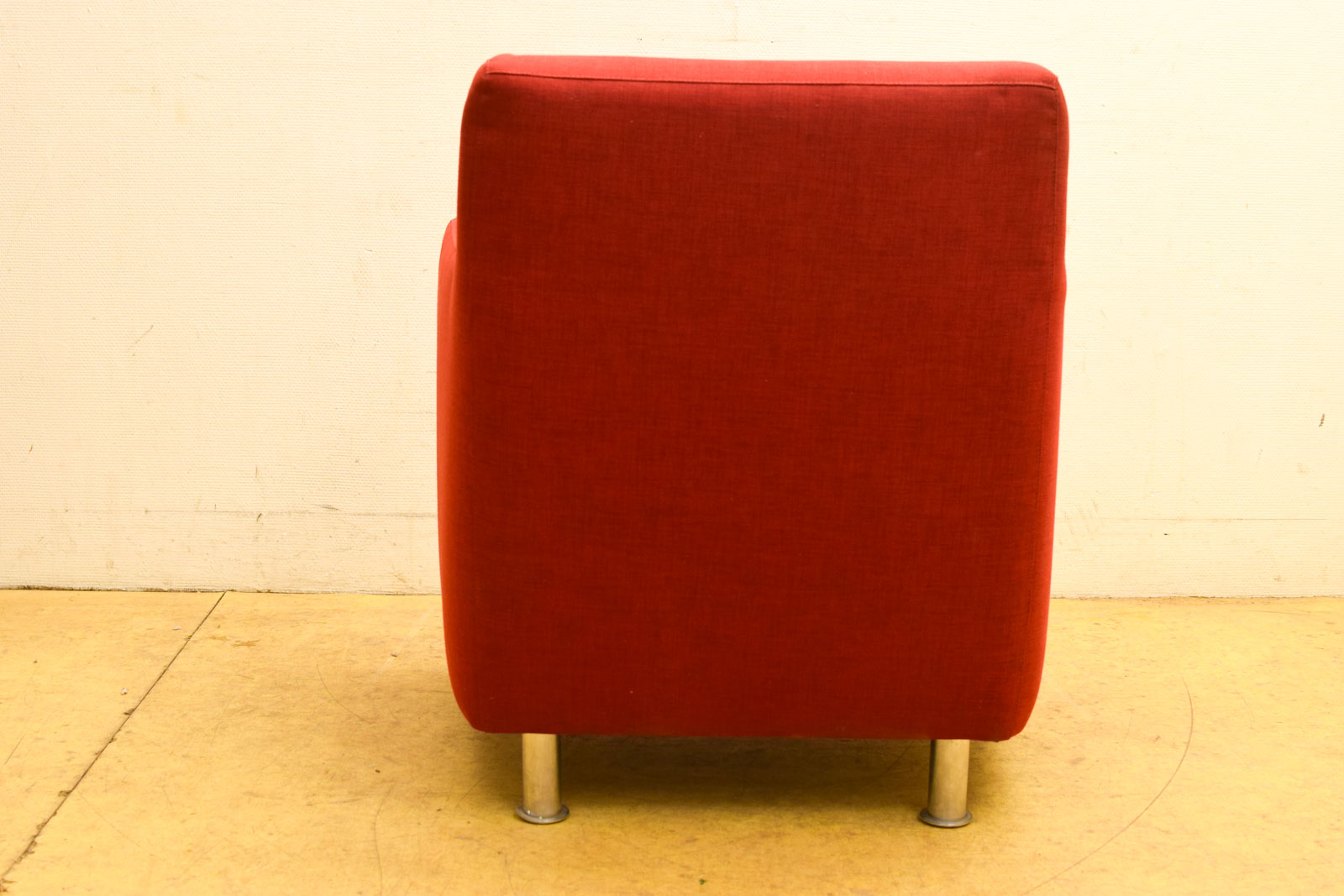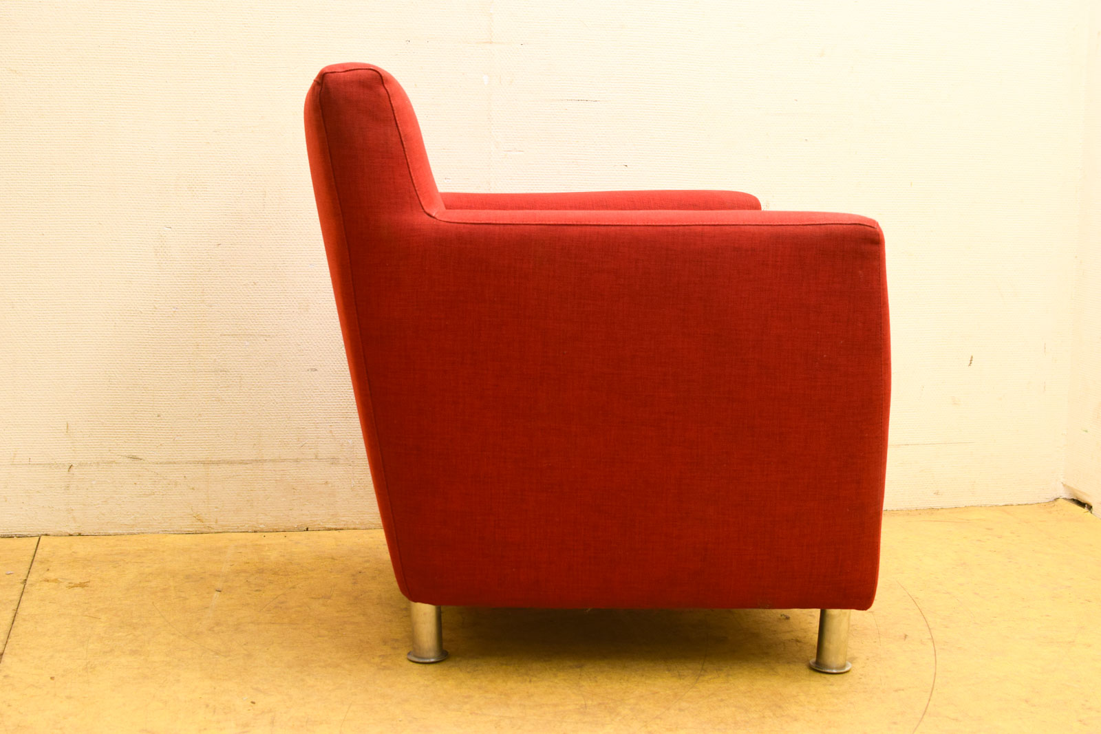 Moderne rode fauteuil met armleuningen in stofbekleding. Compact formaat (78 cm breed) met metalen poten. Enkele vlekken op de stof, verder in redelijke staat.