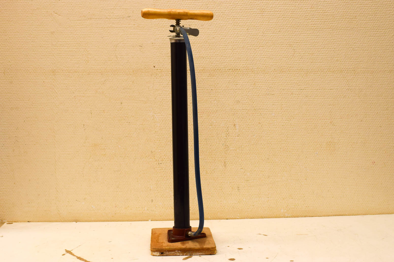 Deze vintage fietspomp op houten voet is een mooi voorbeeld van ouderwetse fietsaccessoires. De pomp bestaat uit een zwart metalen cilinder met houten handvat bovenaan en staat op een rechthoekige houten plank als voet. Het ontwerp is praktisch en eenvoudig: de pomp werkt via een leveringsmechanisme dat je in en uit kunt trekken om lucht in de band te pompen.