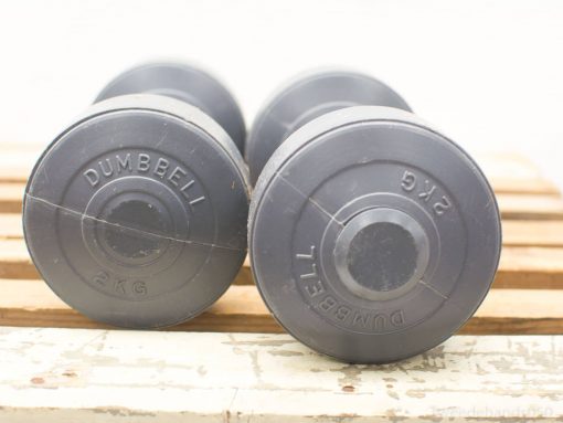 Een set van twee grijze dumbells van 2,5 kg. Hebben gebruikerssporen.