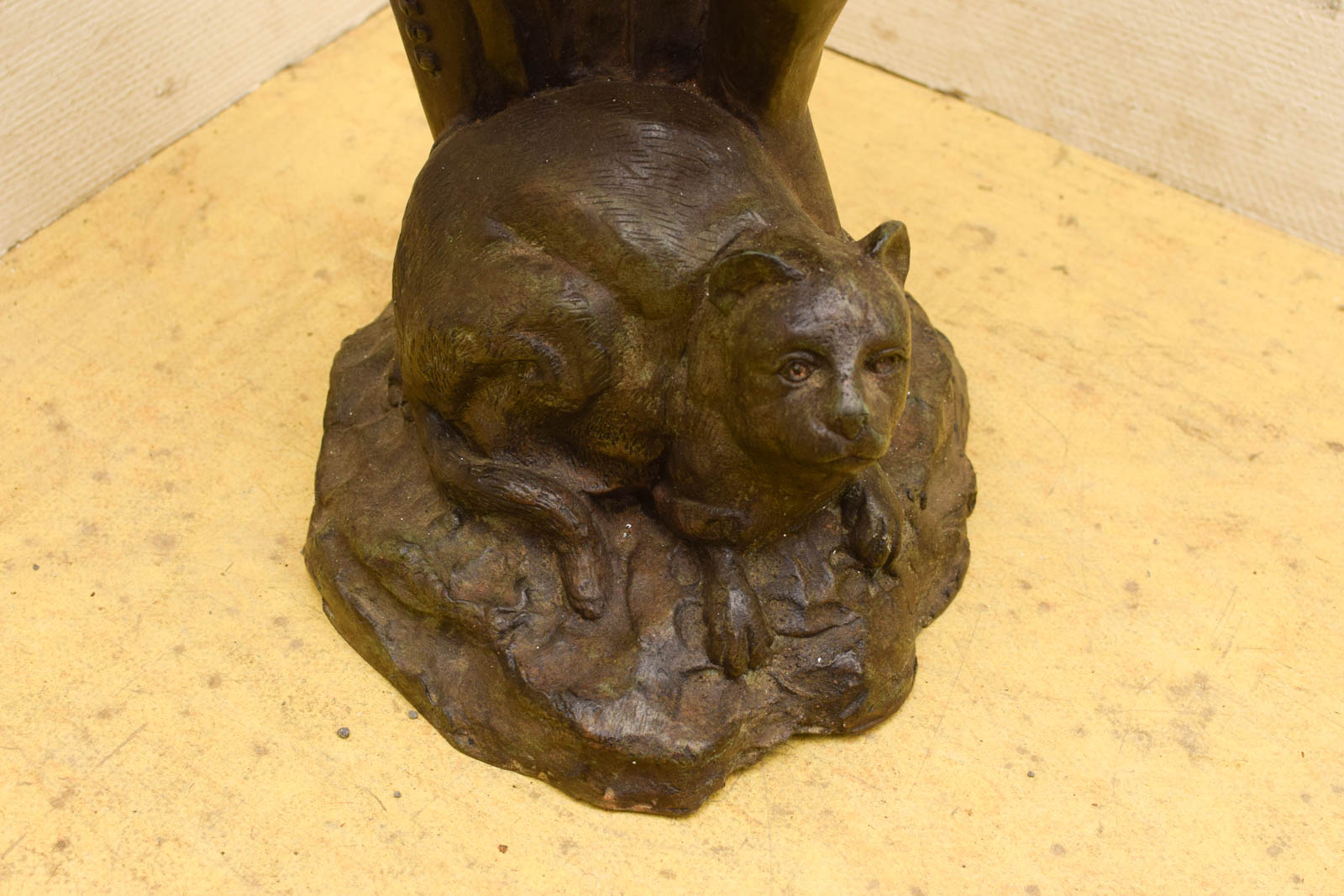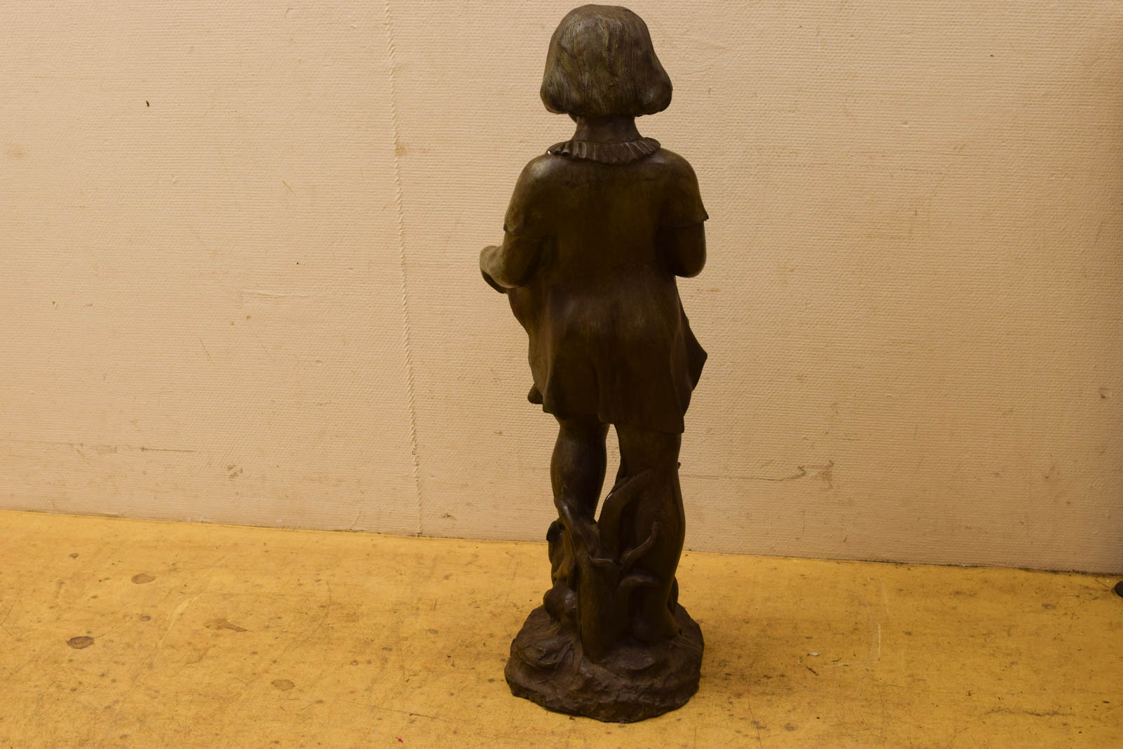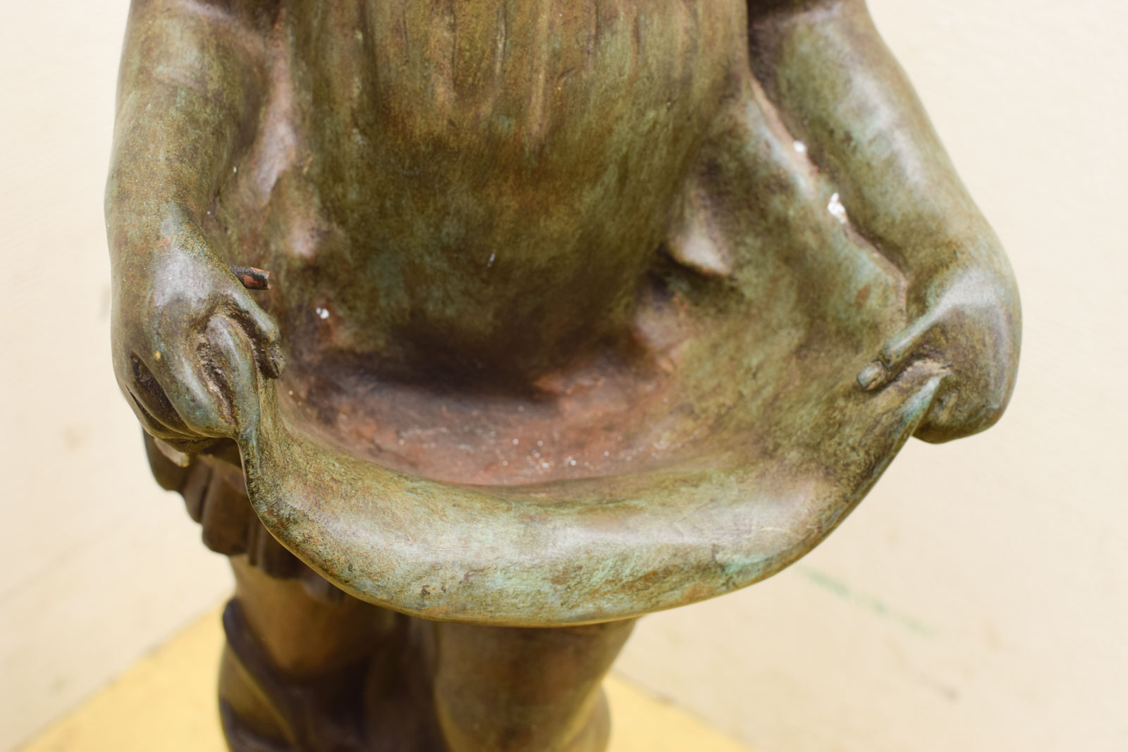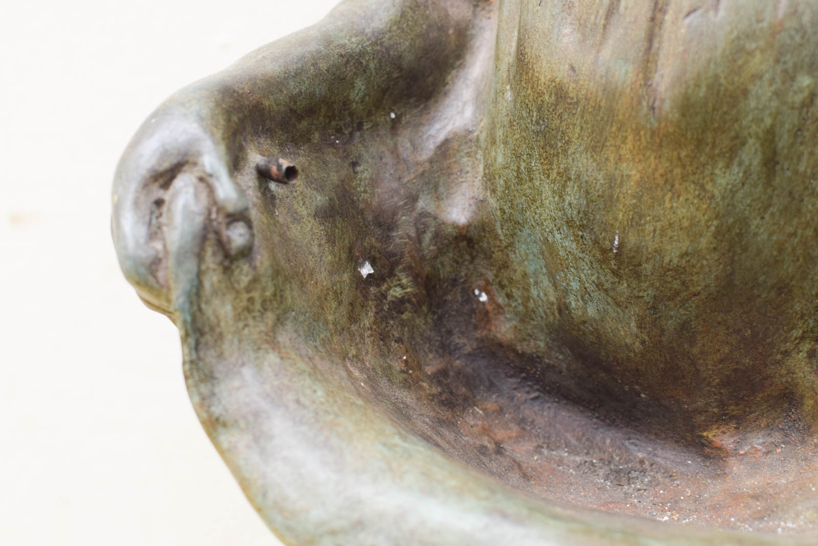 kleur groen/bruin de beeld ziet er nog redelijk netjes uit heeft witte vlekken maar is nog heel de onderkant is de ingang bij het bakje de uitgang
