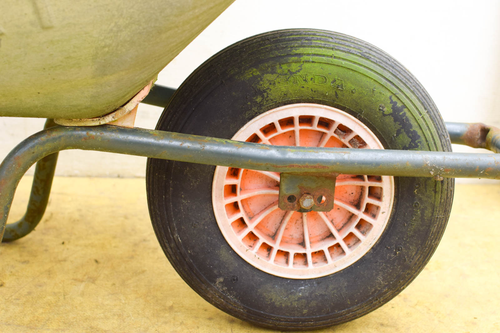 De kruiwagen verkeert in een gebruikt stadium met zichtbare roest op verschillende plekken en groene aanslag op het metaal. De kleur wijkt af van fabrieksnieuw groen en heeft een eerder grijsgroen, vervuild uiterlijk gekregen. De bak toont gebruikssporen en roestvlekken aan de binnenkant. Het frame en de handvaten zijn degelijk uitgevoerd. Het wiel ziet er nog solide uit.