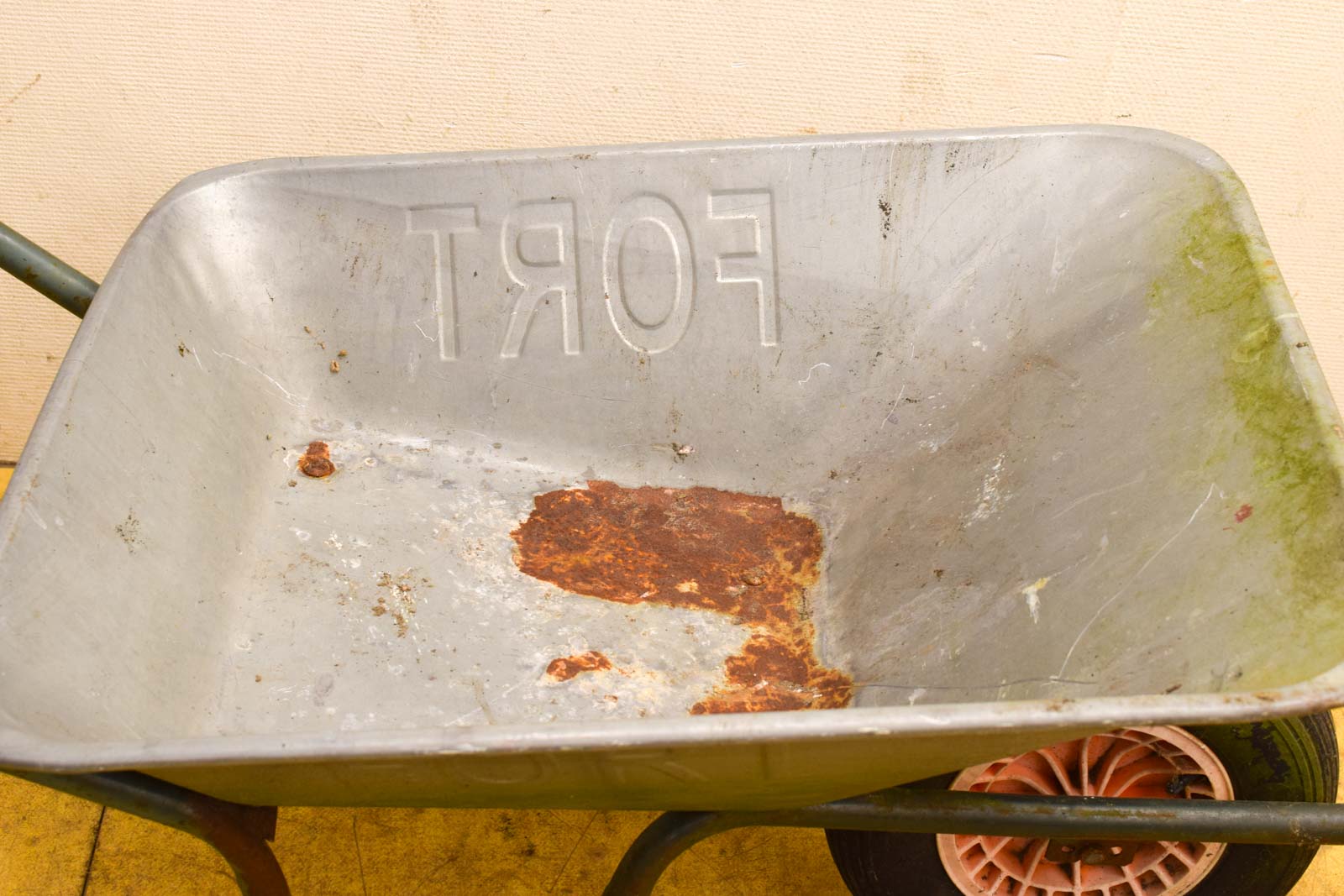 Dit is een Fort metalen kruiwagen, model 50500. De bak meet 83,5 cm in de breedte en 30 cm in de hoogte. Het is een robuuste kruiwagen voor tuinwerk, materiaal vervoer en klussen rond het huis.