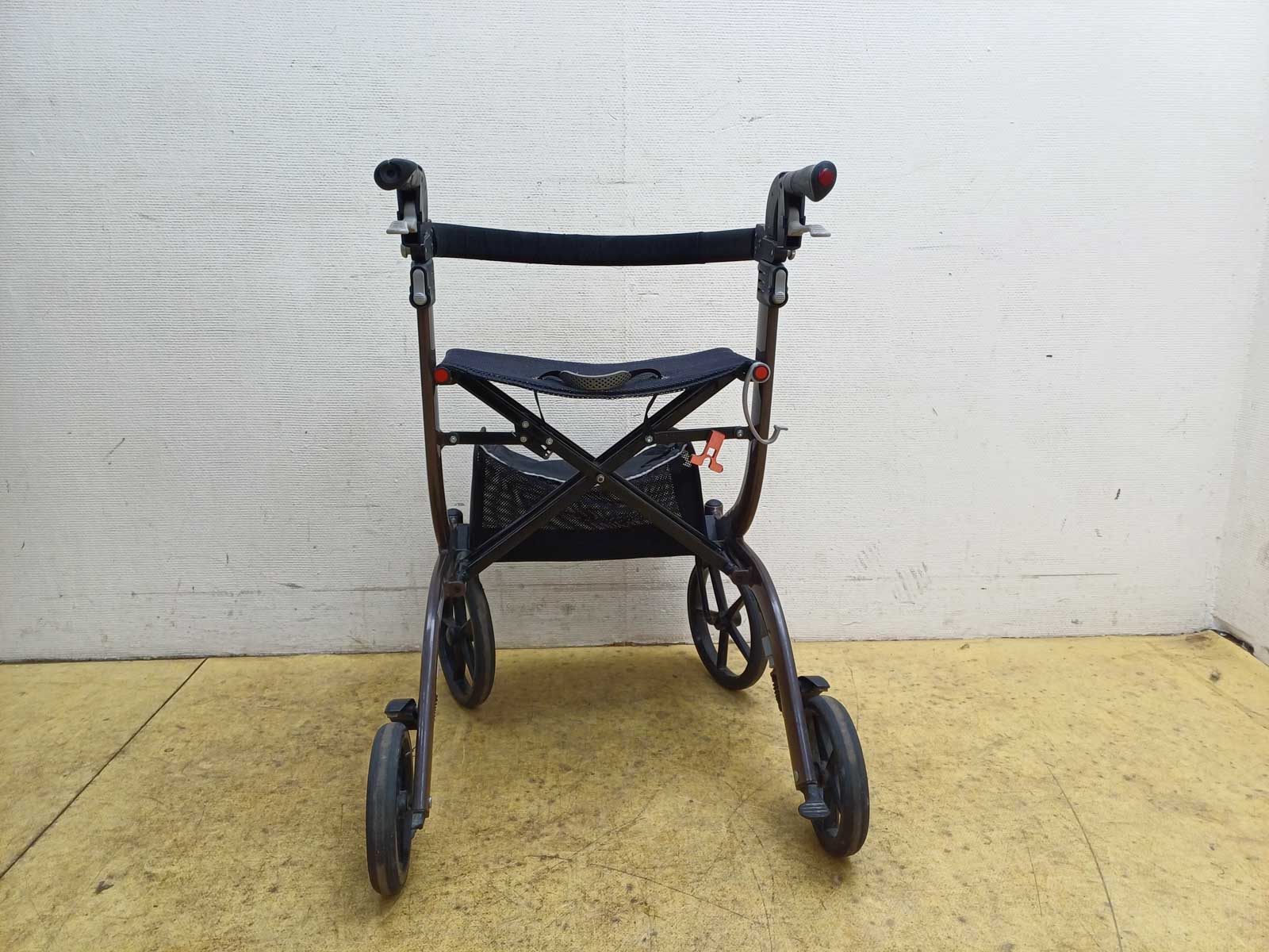 de rollator is inklapbaar heeft en aparte kleur bruin de rollator is gebruikt de handvaten zijn in hoogte verstelbaar