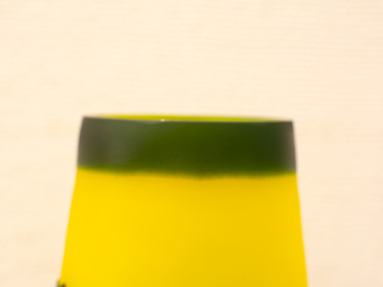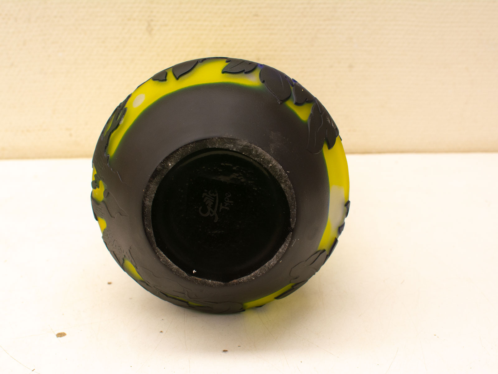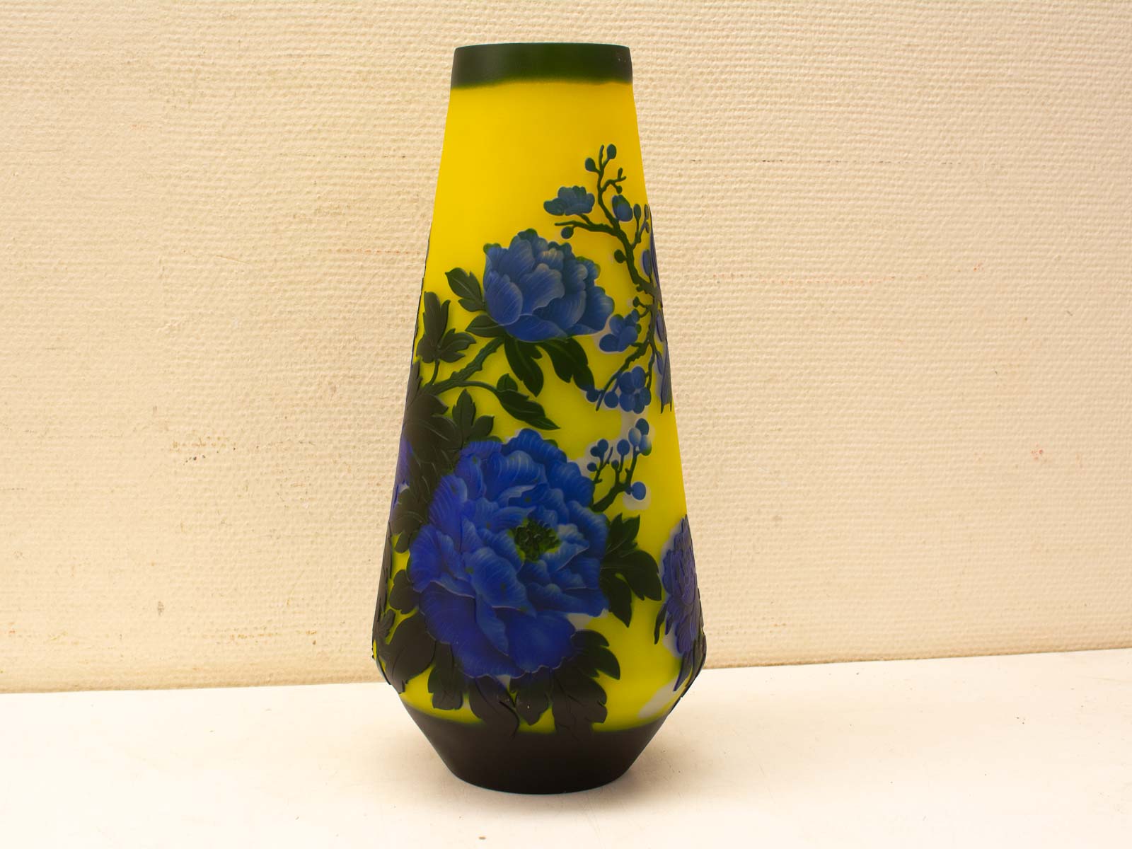 de vaas heeft een prent van 2 parkietjes en bloemen het glas ziet er nog goed uit diameter bovenkant opening 10 cm