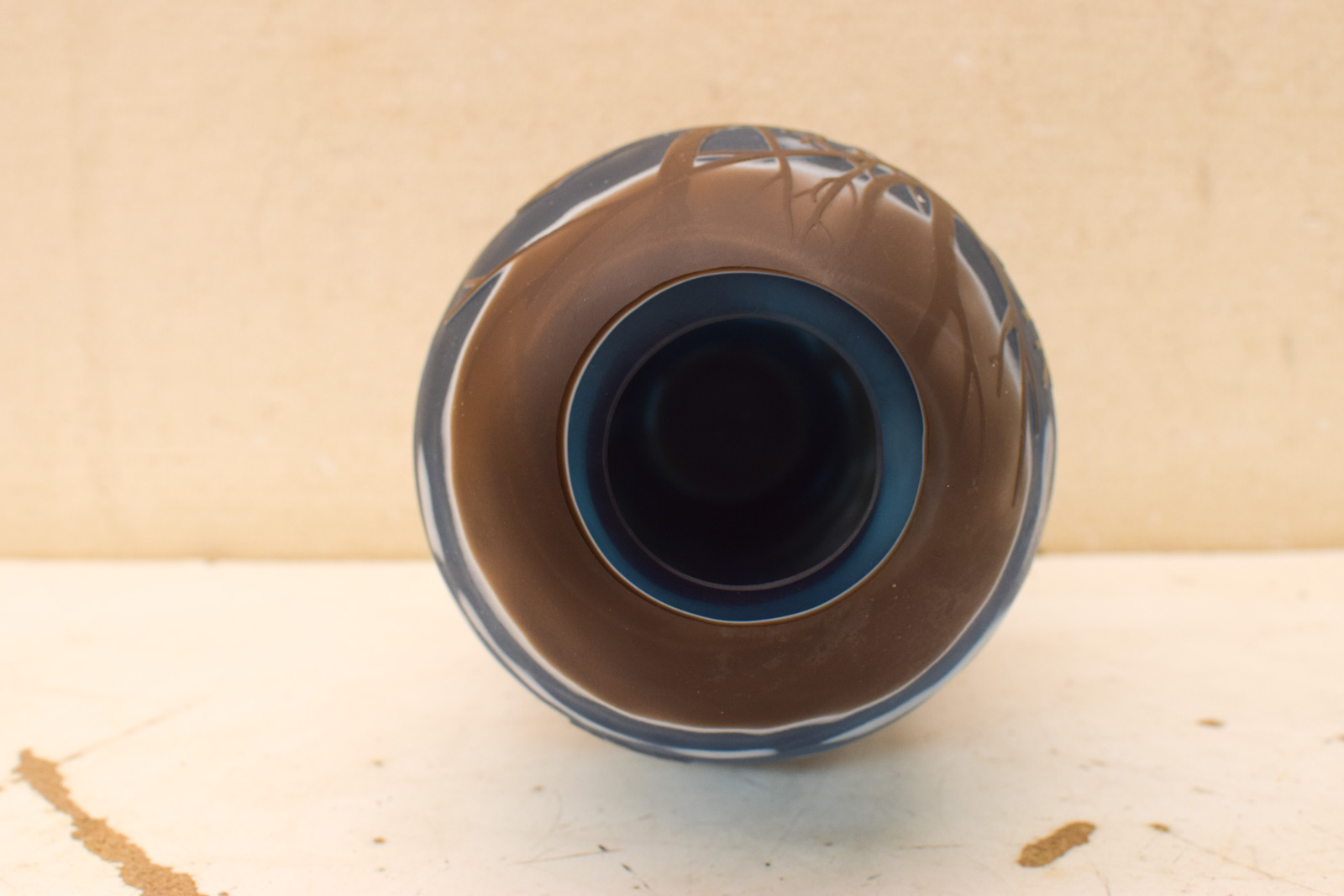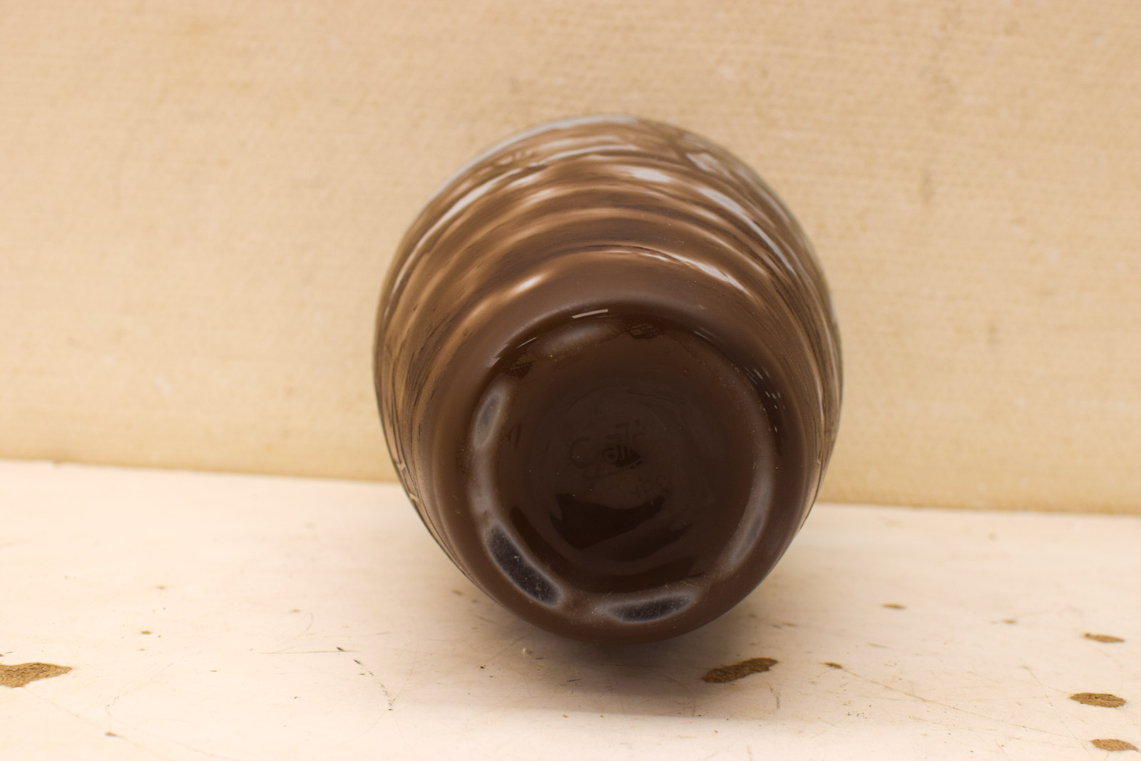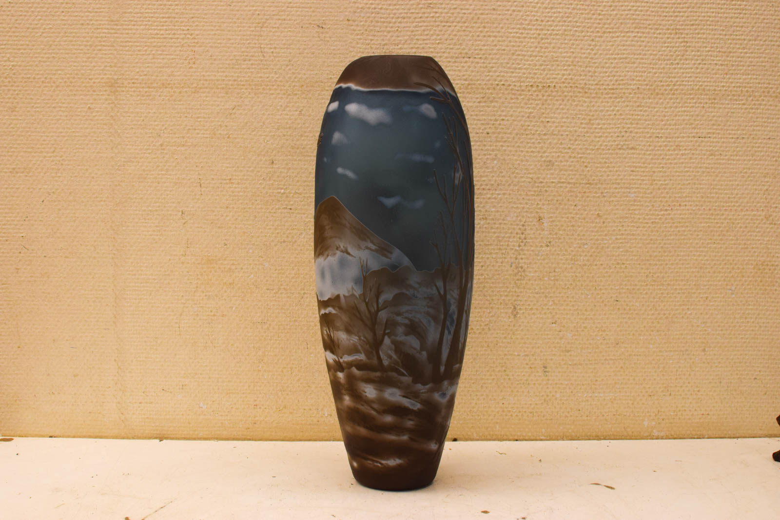 Deze glazen vaas is een mooi voorbeeld van de art nouveau-stijl, de kunstbeweging uit eind 19e en begin 20e eeuw die bekend staat om organische vormen en natuurmotieven. De Gallé glazen vaas toont twee vogels in vlucht boven landschapselementen in warm bruine tinten, tegen een blauwgrijs achtergrond. Het dessin is gegraveerd in het glas, een techniek die Gallé meester was.