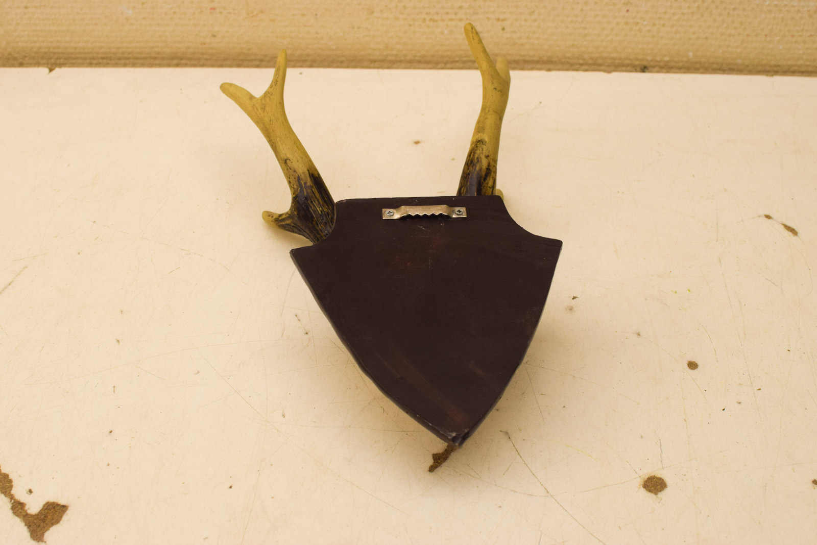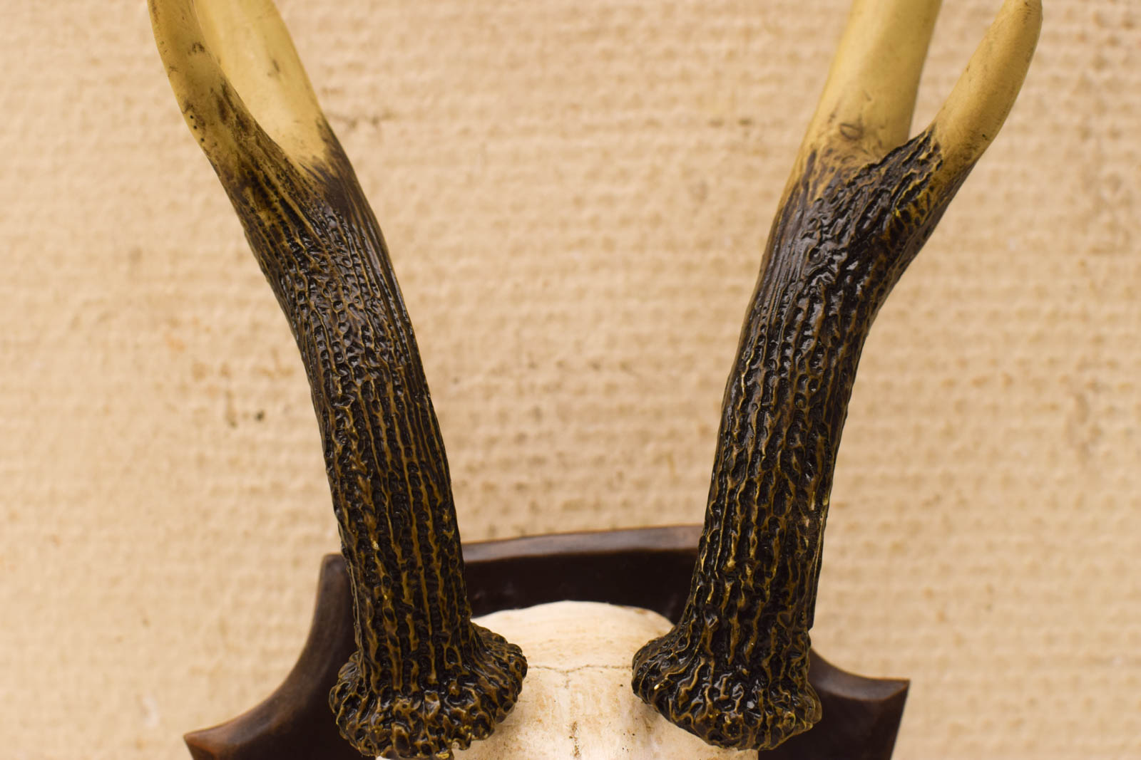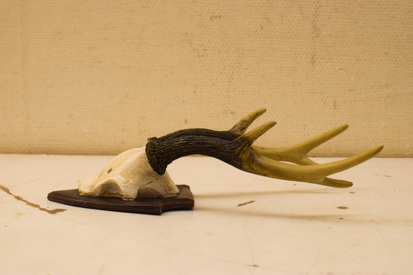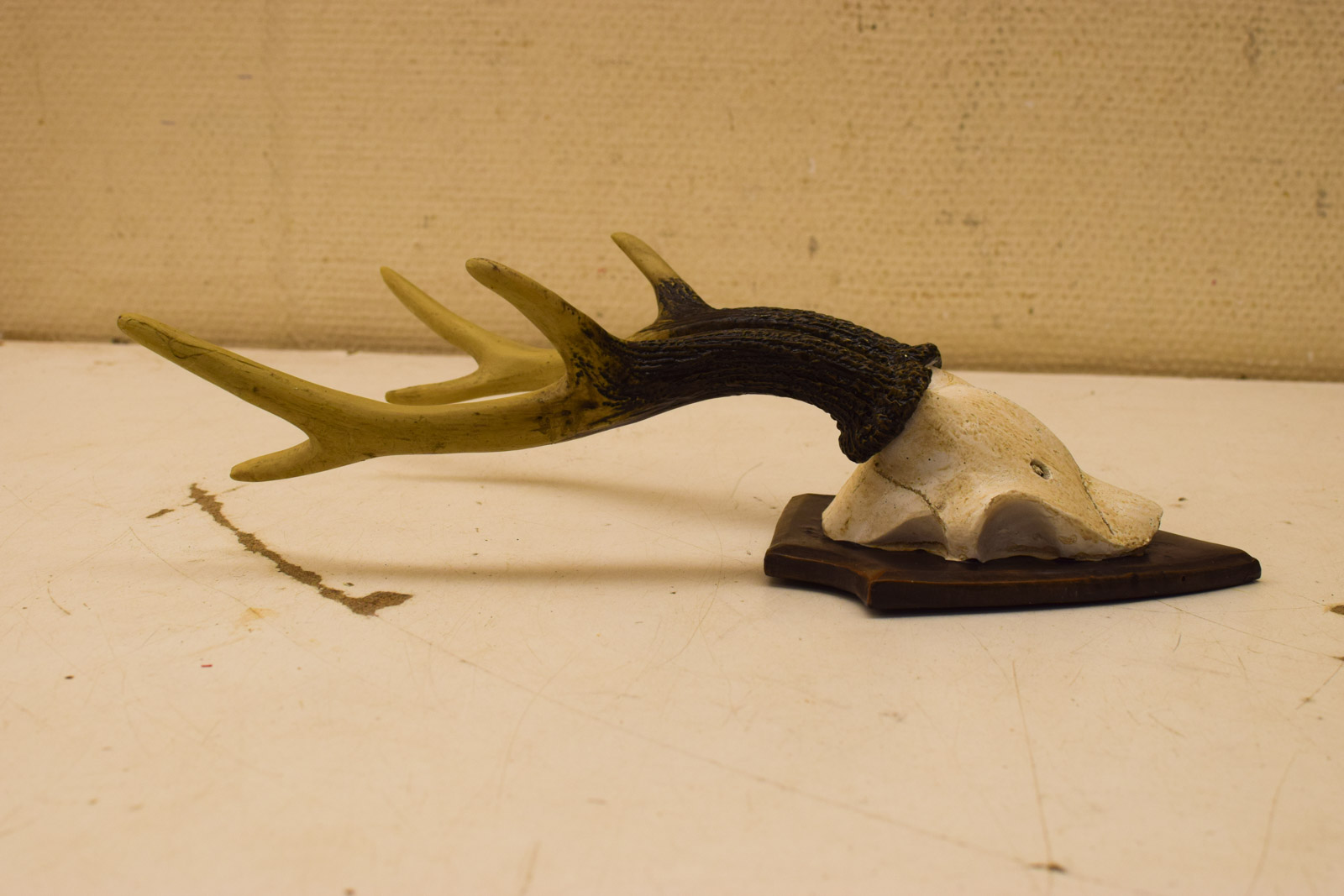 het gewei is nog heel de schedeltje heeft 3 barsten alleen de gewei gemeten 23 cm het houten plankje gemeten breed 13,5 cm hoog 14,5 cm