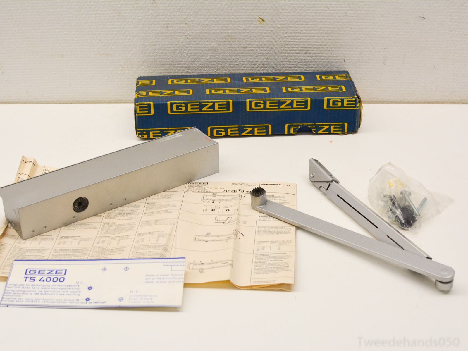 Een nieuwe bovenliggende deurdranger van het merk Geze,type TS 4000. Met handleiding. Sluitkracht 1-6 volgens EN 1154, deurbreedte circa 1400mm, openingshoek 180 graden, vastzetbereik tot circa 150 graden, voor Din rechts en Din links te gebruiken.