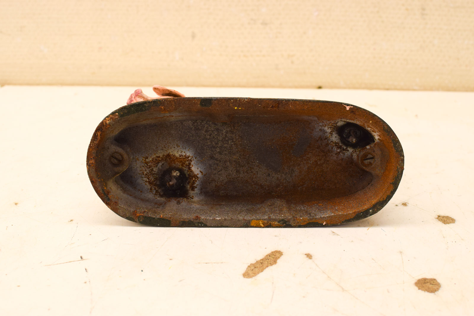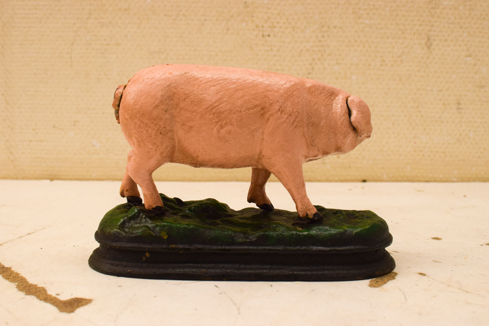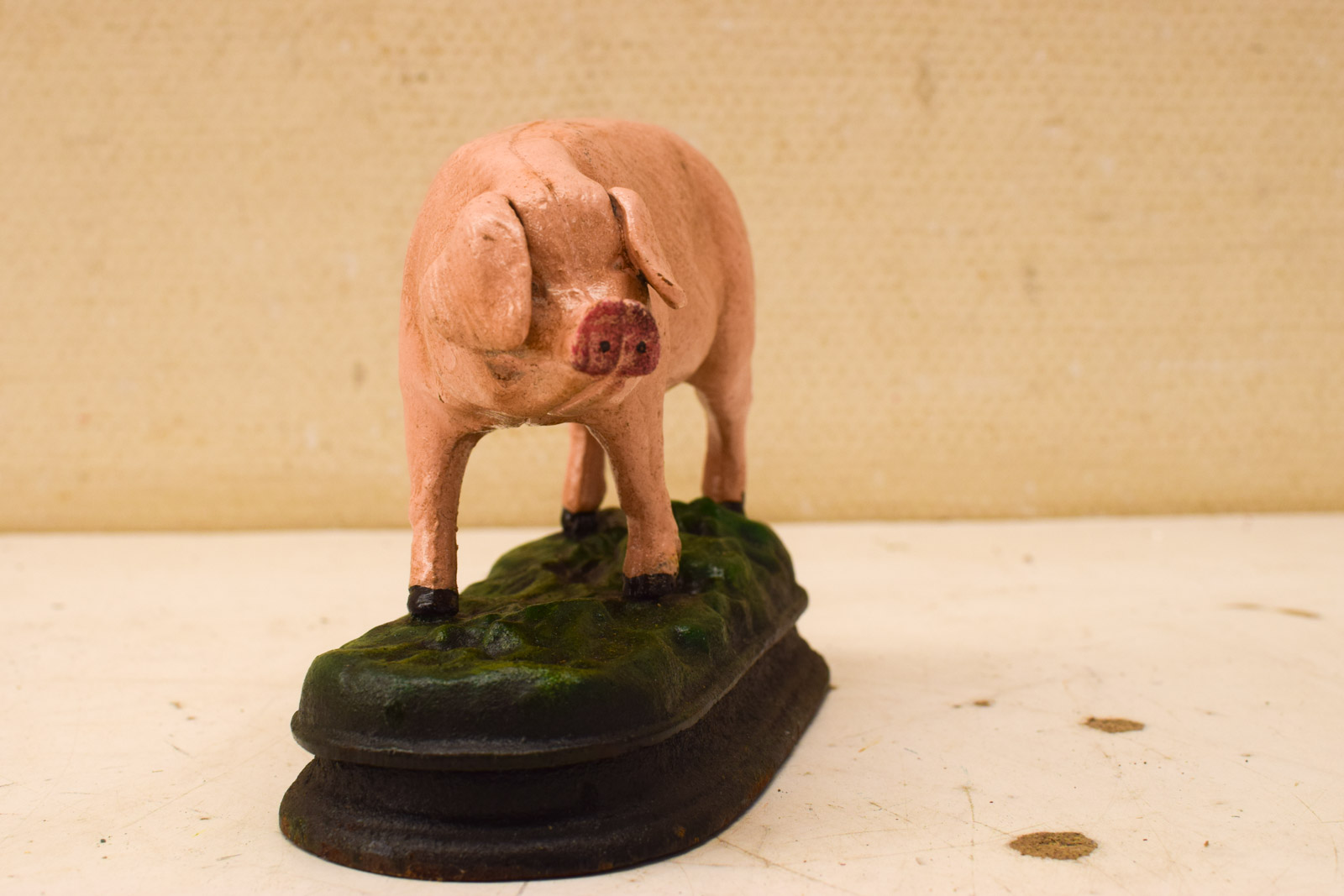 Het gietijzeren beeld varken vertoont roest en vlekken, wat typerend is voor dit materiaal na gebruik. De rode/roze kleur van het ijzer is nog goed zichtbaar, maar de oppervlakte toont duidelijke sporen van leeftijd en weersomstandigheden. De voet heeft groene patina. Dit zijn natuurlijke kenmerken die het stuk authenticiteit geven en geschikt maken voor verzamelaars of liefhebbers van vintage decoratie.