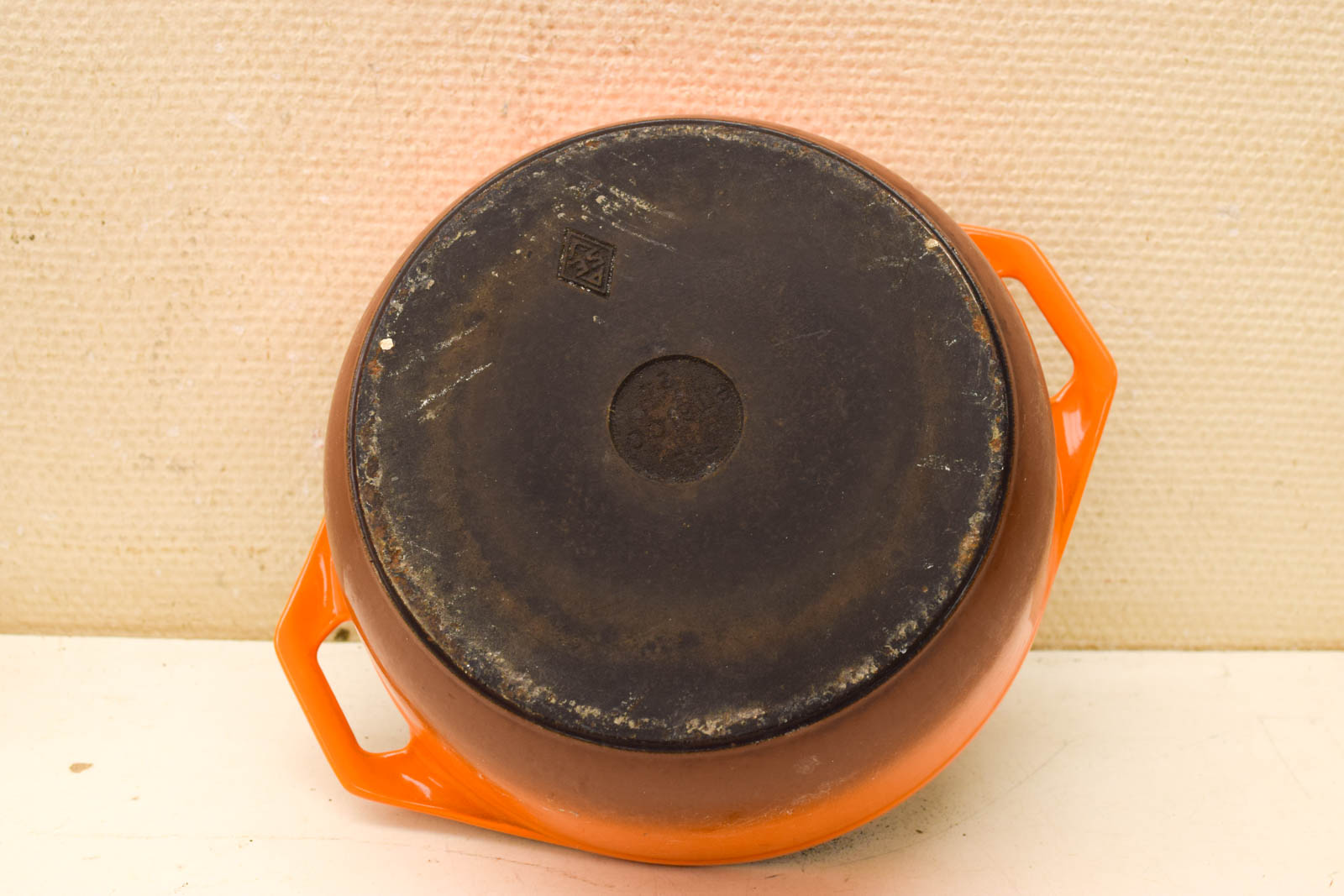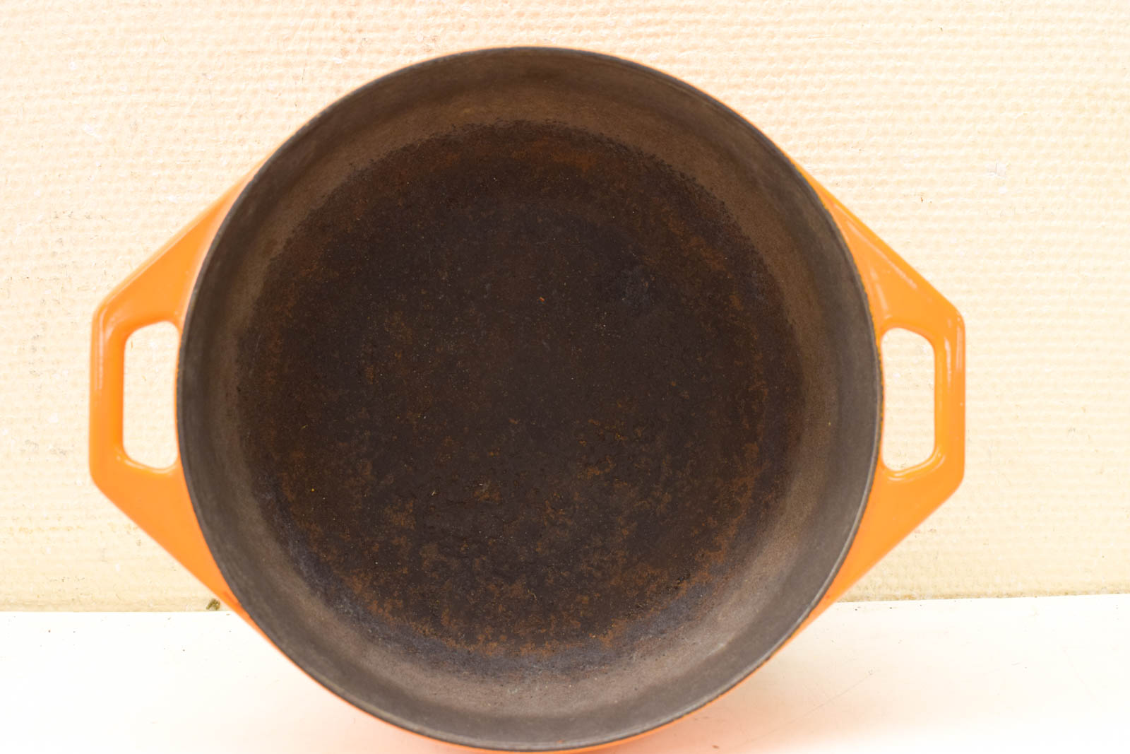 Dit exemplaar is duidelijk gebruikt en toont dit ook eerlijk. De binnenkant heeft roest, aanslag en gebruikssporen. De buitenkant is in betere toestand. Gietijzeren potten en pannen kunnen echter prima worden opgefrist met wat schuurwerk en oli als je daar zin in hebt. Voor wie werkelijk wil koken met een degelijk stuk keukengerei: dit is een goeie basis.