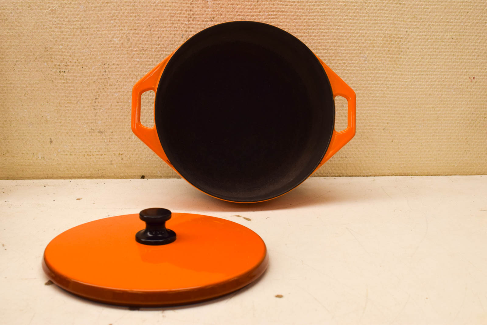 Deze gietijzeren braadpan in levendig oranje is een klassieke keukenpan die generaties meegaat. De braadpan heeft afmetingen van 30 cm breed, 24 cm diep en 12 cm hoog, waardoor hij goed past in een standaard oven en voorziet in de behoefte van gezinsmaaltijden. De twee gegoten oren bieden een stevige grip voor het hanteren.