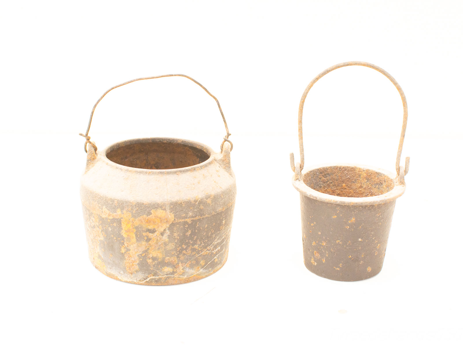 de beide potten hebben roest de kleine pot is zonder hendel hoog 7 cm diameter bovenkant 8,5 cm de grote pot is zonder hengsel hoog 9,5 cm en de diameter van de pot is 9 cm