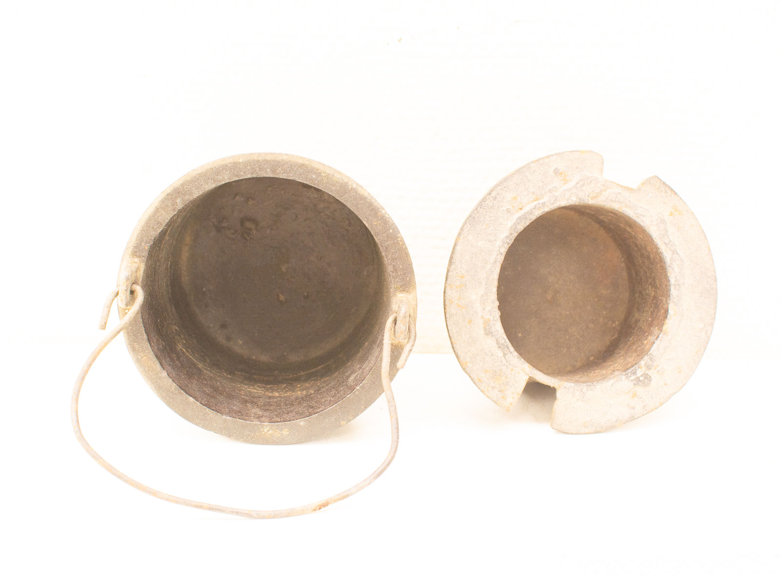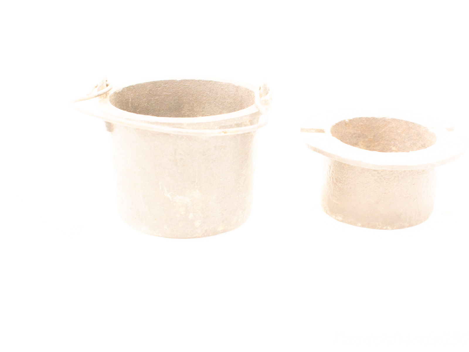 de kleine pot is hoog 6 cm diameter met rand 13 cm de grotere pot is hoog 9 cm diameter 13 cm ze hebben beiden wat roest