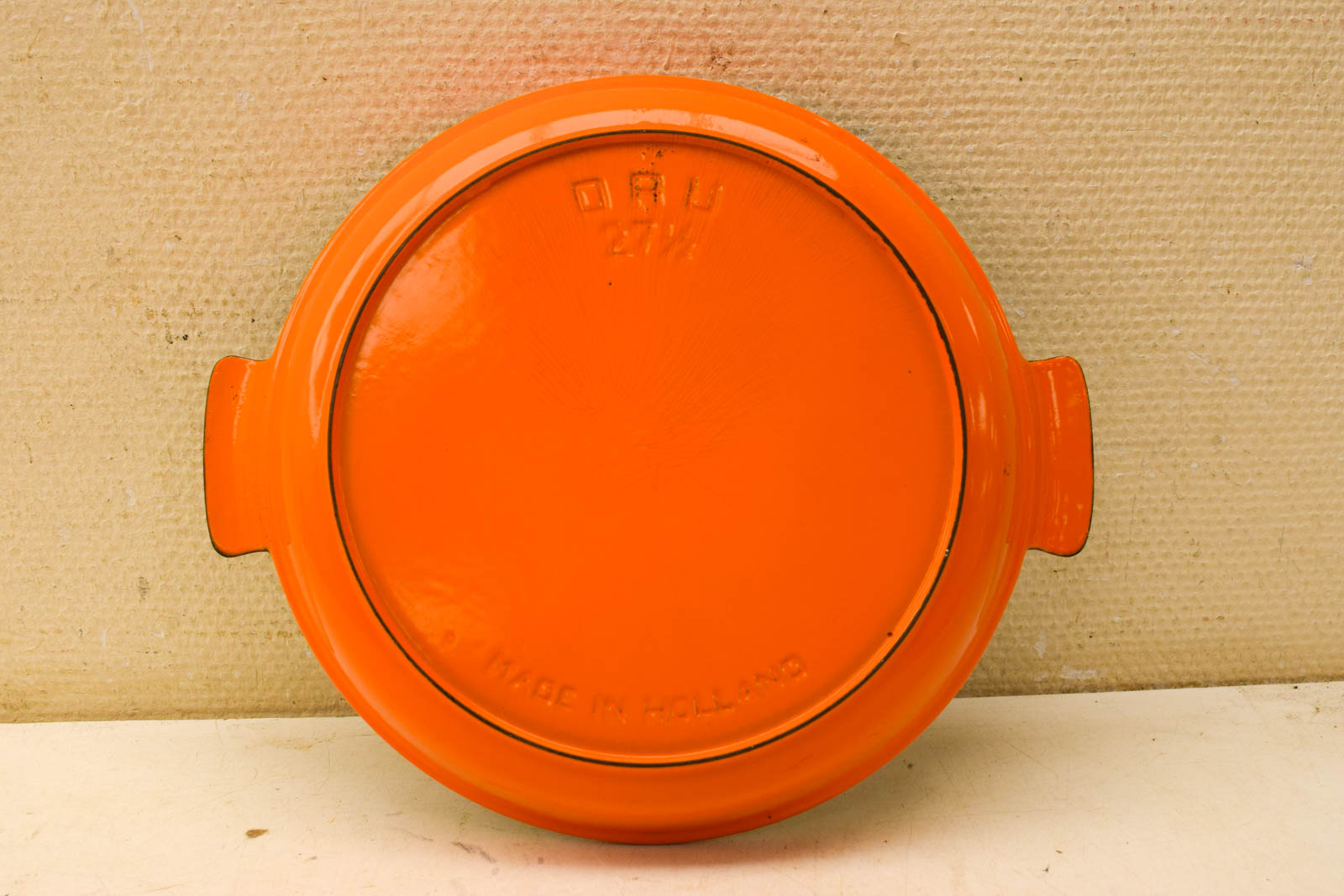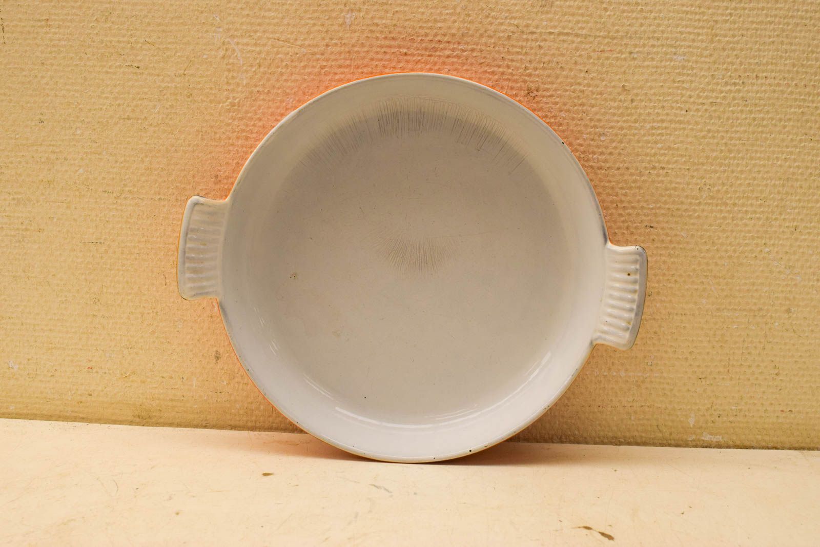 de ovenschaal is gebruikt en heeft gebruikssporen zoals krassen gemeten van oor tot oor 33,5 cm hoog 4,5 cm