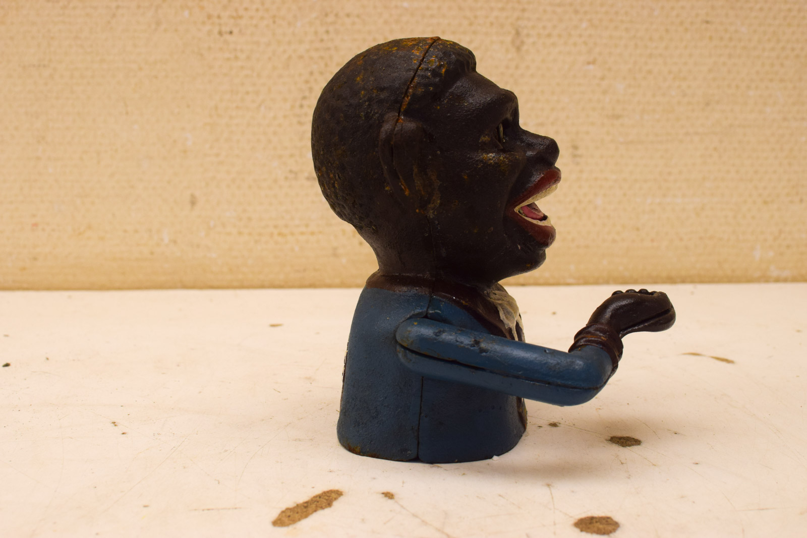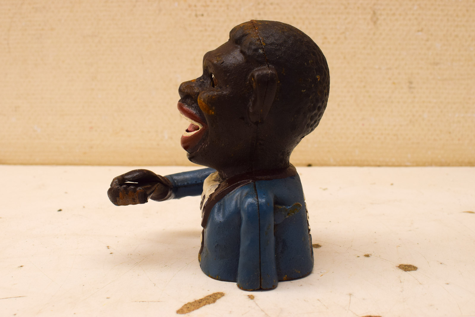 Door de jaren heen heeft de spaarpot wat roest verzameld, vooral zichtbaar op het gietijzer. Dit is een eerlijk gebruiksspoor dat het verhaal van het object vertelt. De afmetingen zijn compact: ongeveer 12,5 centimeter breed, 12 centimeter diep en 16 centimeter hoog, wat hem geschikt maakt voor een plankje of verzamelkast. Het mechanisme werkt nog prima, dus je kunt hem echt gebruiken als spaarpot of als decoratief stuk voor liefhebbers van antiek speelgoed.