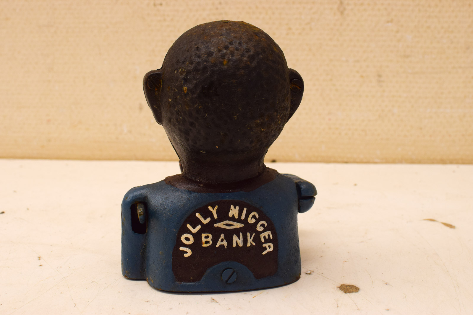 De spaarpot is gemaakt van gietijzer, een materiaal dat duurzaam is en een authentiek gevoel geeft. Hij is voorzien van een blauwe jasje en heeft rode lipjes die de aap een vrolijke uitstraling geven. Op de achterkant staat duidelijk de tekst Jolly Nigger Banker gegraveerd, het originele merknaam van deze klassieke spaarpot.