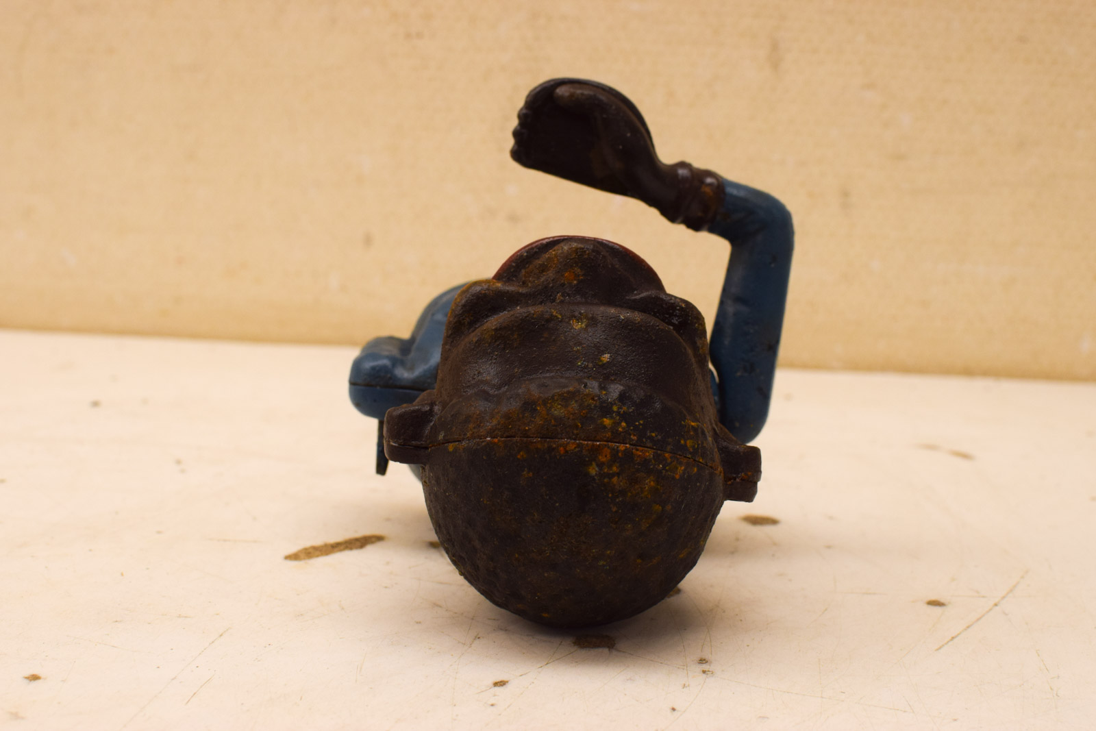 Deze gietijzeren aap spaarpot is een charmante vintage spaarvariant die je niet zomaar tegenkomt. Het werkmechanisme is simpel maar ingenieus: je legt kleingeld in de hand van de aap, drukt op zijn hand en het geldstuk verdwijnt via een schuif in zijn mond. Een leuk detail dat kinderen (en volwassenen) jarenlang heeft vermaakt.