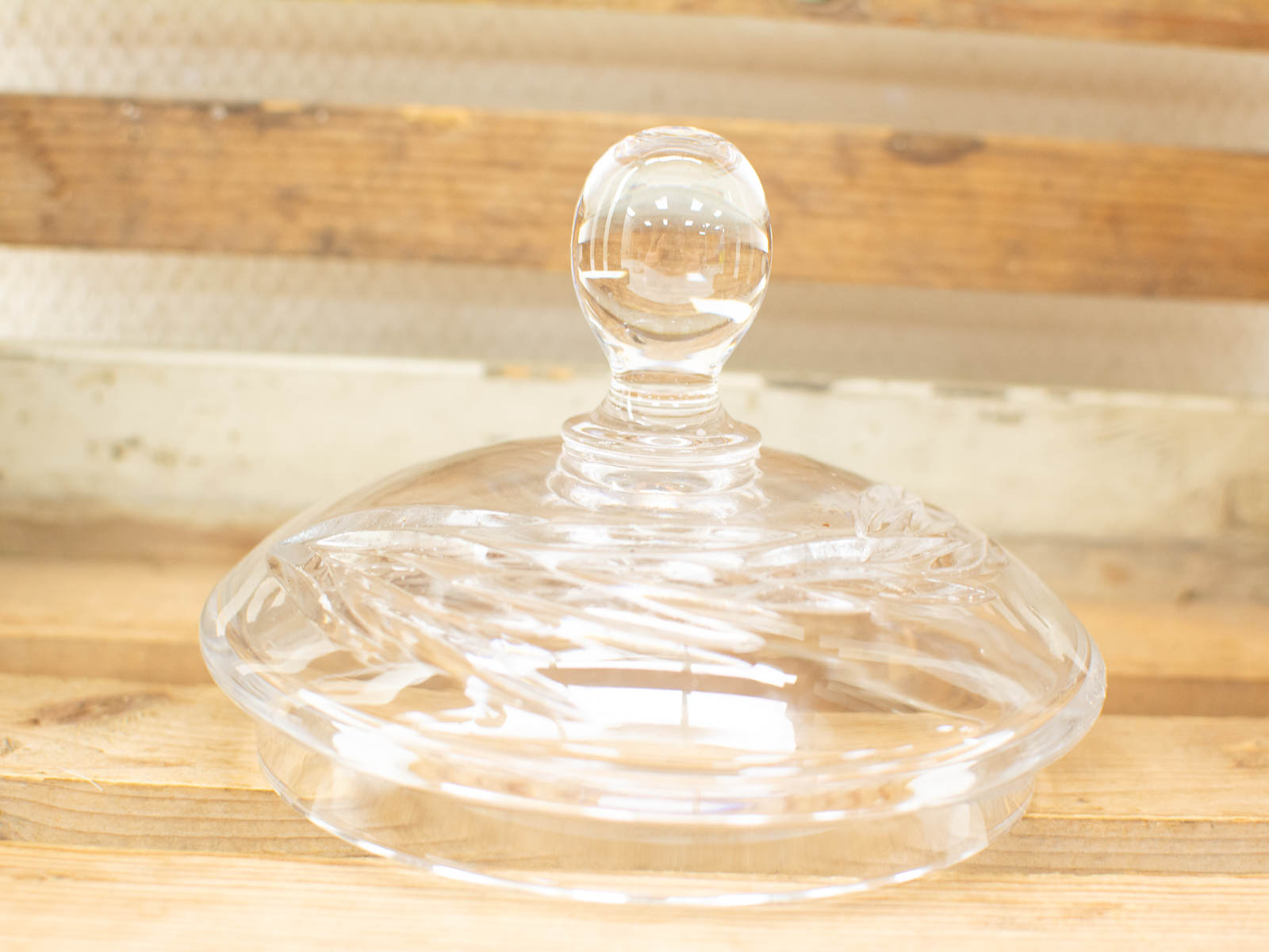 op de rand mist een stukje zie foto binnenkant bodem heeft krassen verder ziet het er nog goed uit diameter bovenkant opening 16 cm hoogte gemeten zonder deksel 6,5 cm