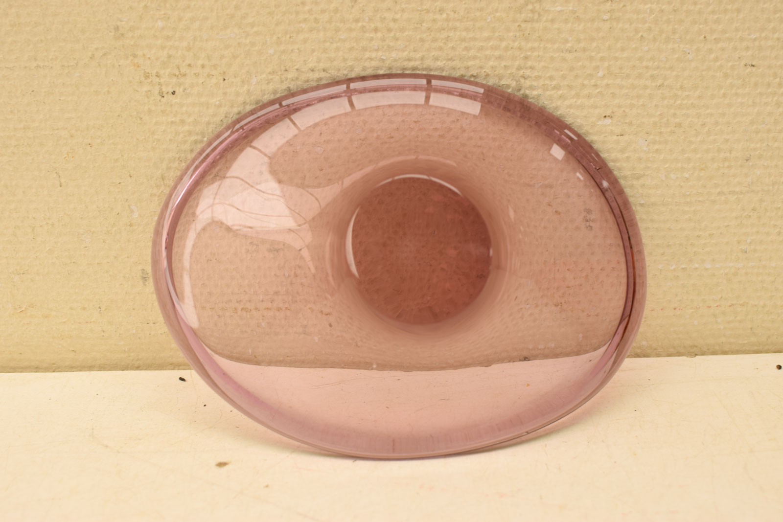 het glas van de schaal heeft een paarse gloed heeft bij de rand een bel in het glas de glas is nog heel en heeft krasjes en bellen