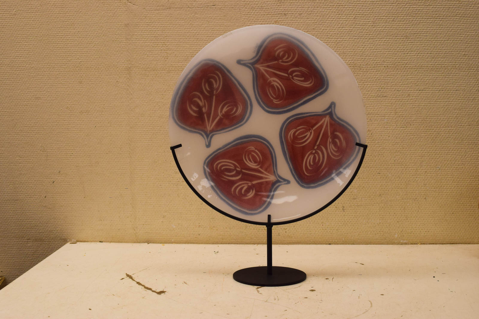 diameter van de schaal 39 cm de stander is van metaal ziet er nog goed uit