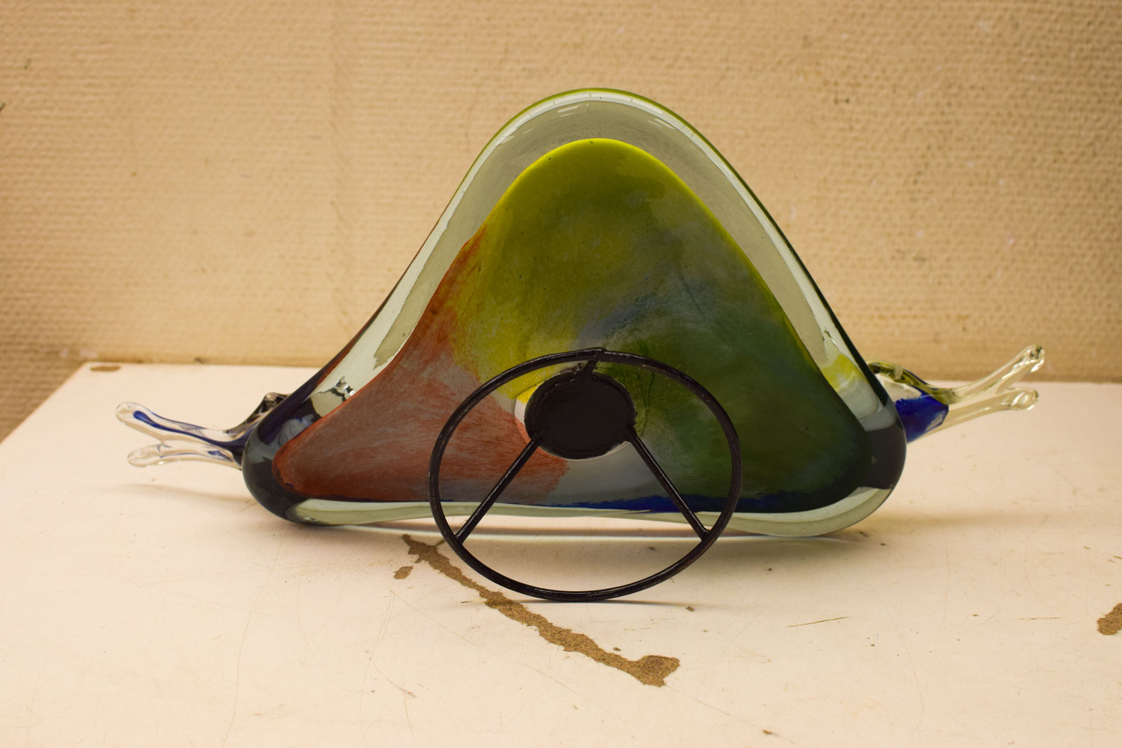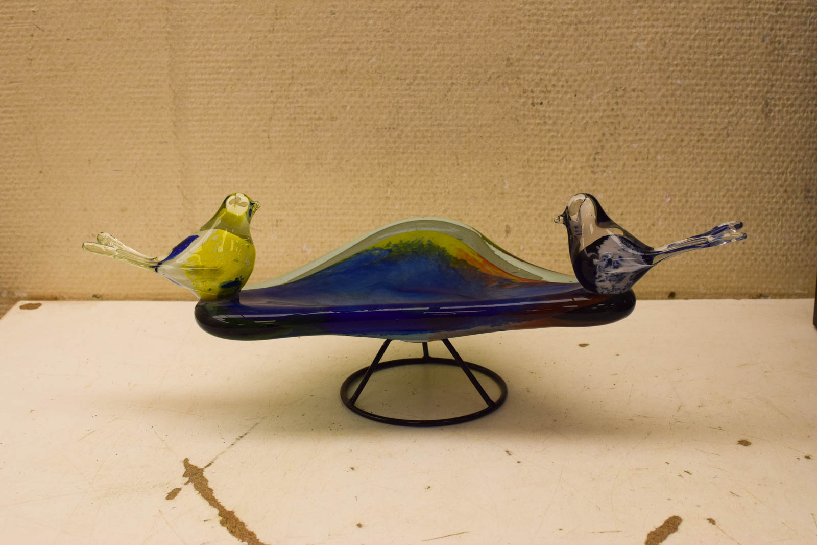 Het glas vertoont normale gebruikssporen van leeftijd en gebruik. De vogeltjes zelf zijn goed geconserveerd en blijven de aandacht trekken. Dit is het soort accessoire dat werkelijk niet veel meer wordt gemaakt – handgeblazen glas met figuurwerk vraagt vakmanschap.