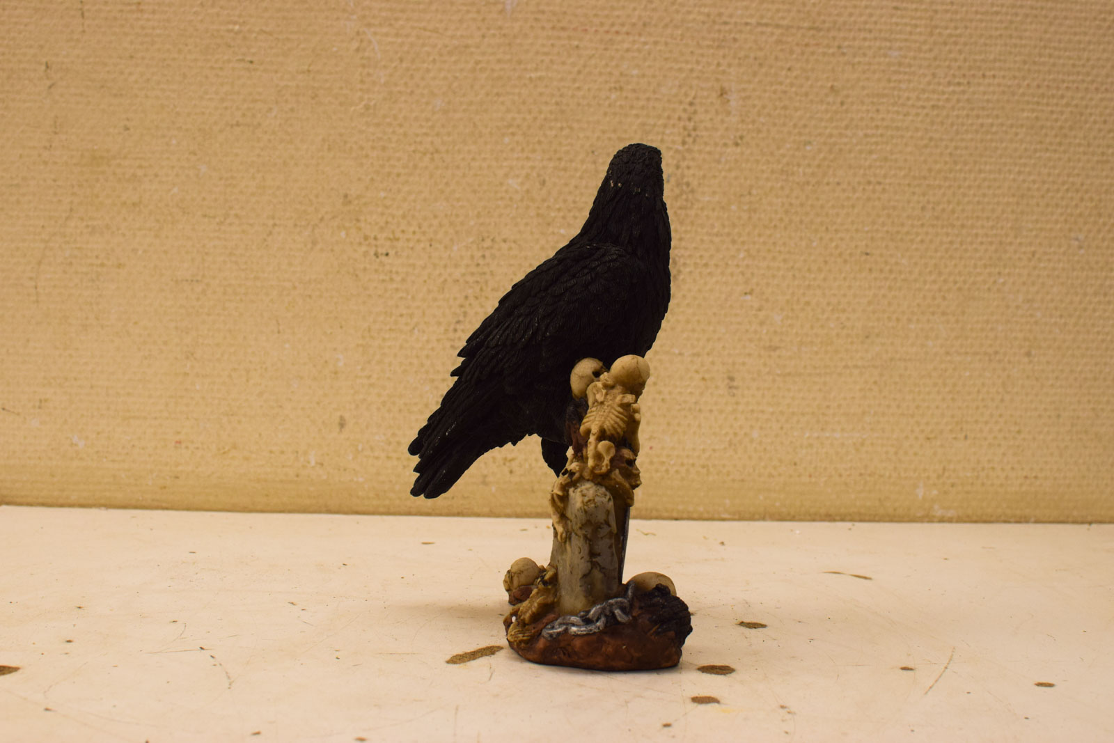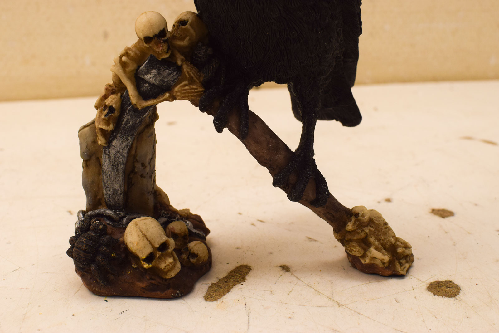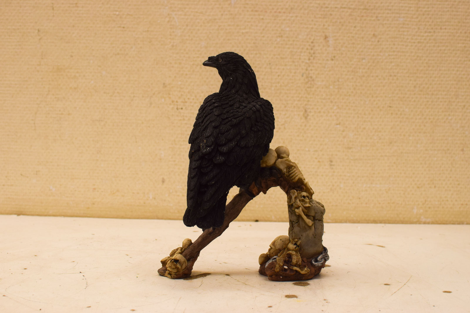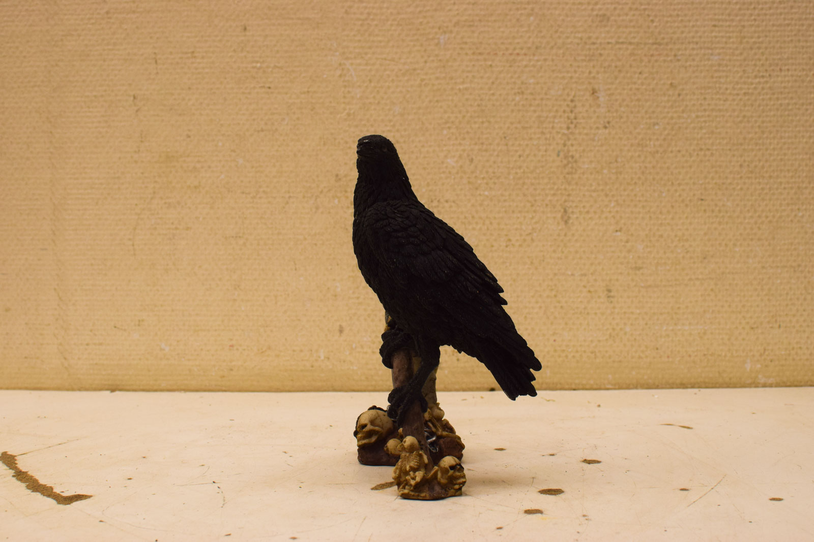 Het beeldje heeft afmetingen van 21,5 cm hoog, 16 cm breed en 10 cm diep, wat het een goed zichtbaar decoratieve accent maakt op een plank of tafel. De zwarte kunststofvleugels en romp van de kraai zijn fijn uitgewerkt met federdetails, terwijl het gouden skeletwerk aan de voet zorgt voor een ondeugende touch.