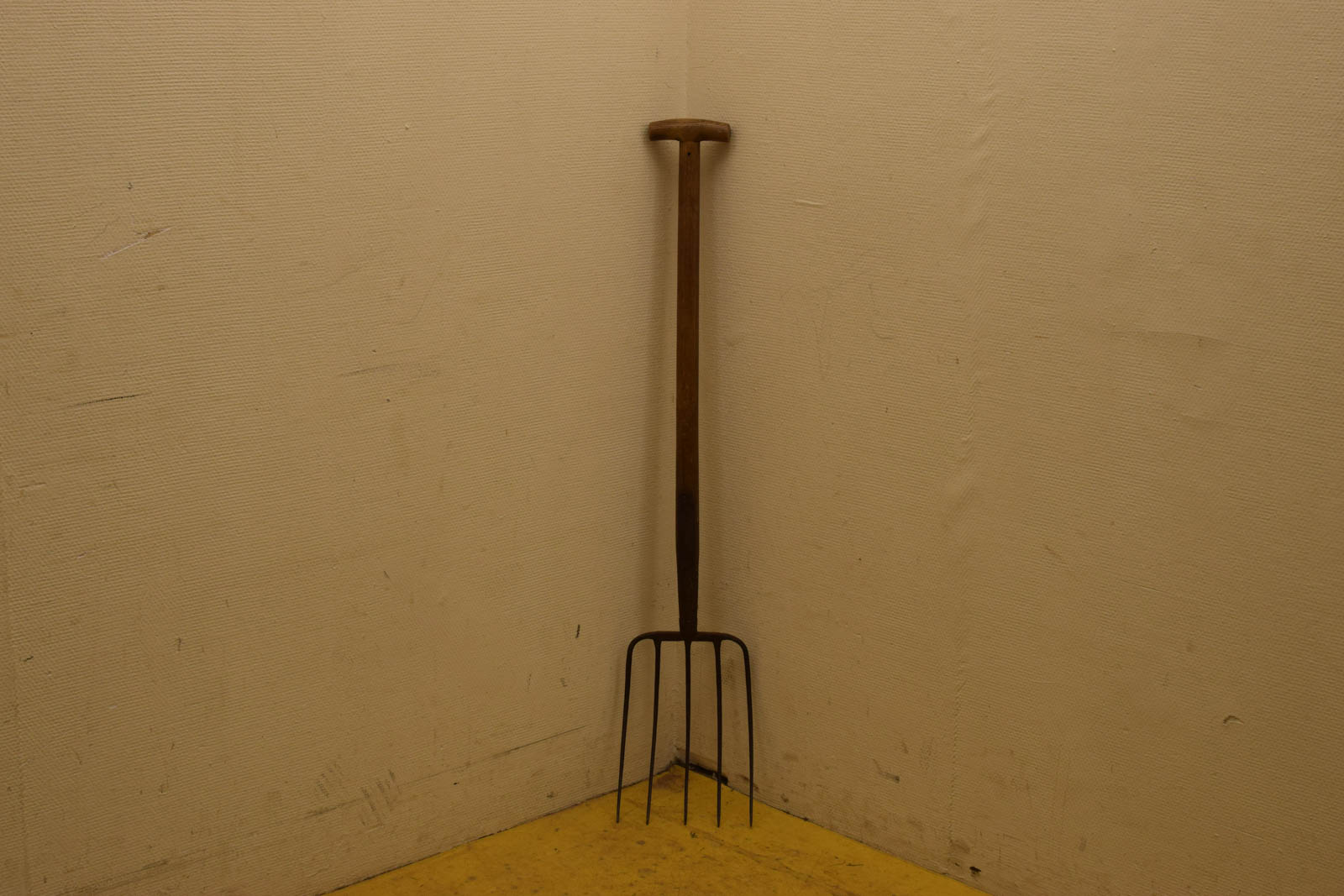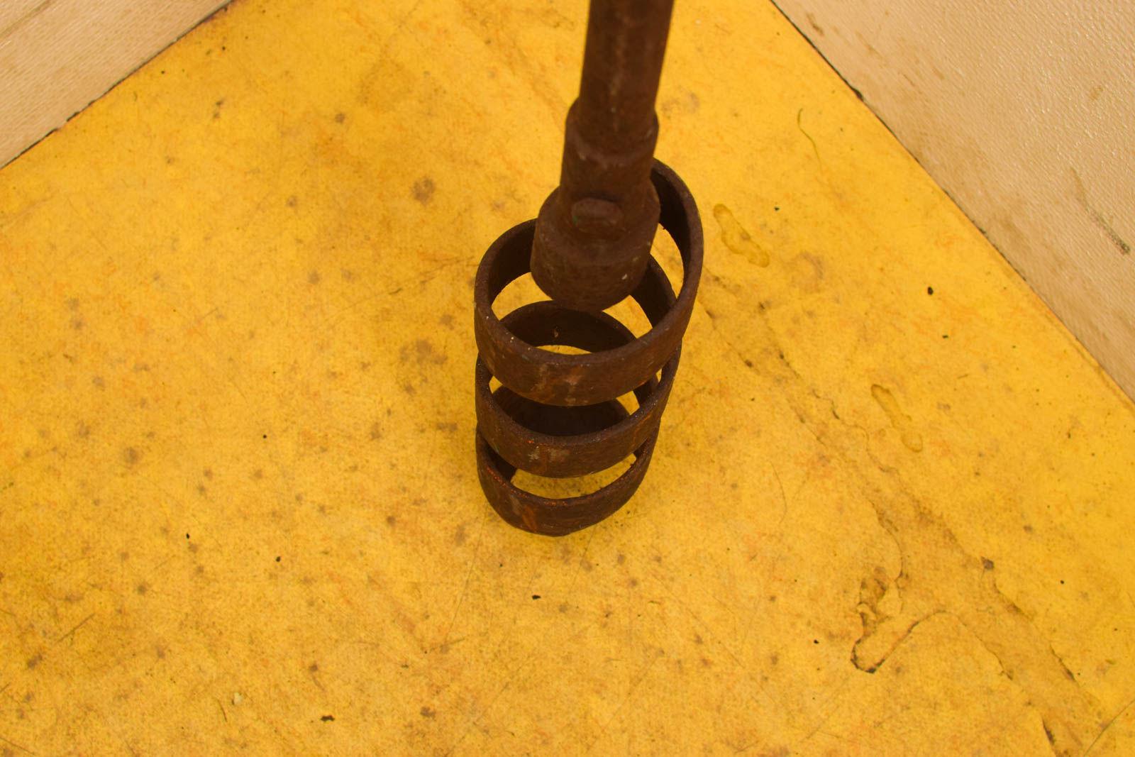 heeft roest is van metaal de handvat is scheef de onderste deel de boor is hoog 27 cm diameter 10 cm