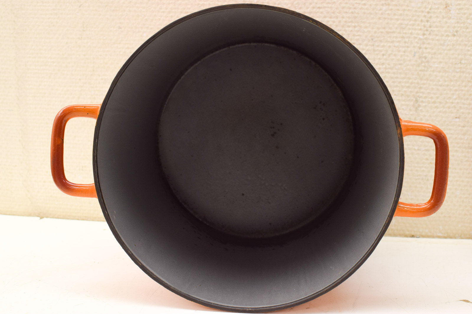 de pan heeft roest vlekken en aanslag aan de binnenkant de pan is gebruikt en heeft gebruikssporen hoogte gemeten zonder deksel 20,5 cm gemeten zonder de ooren diameter bovenkant opening 27 cm