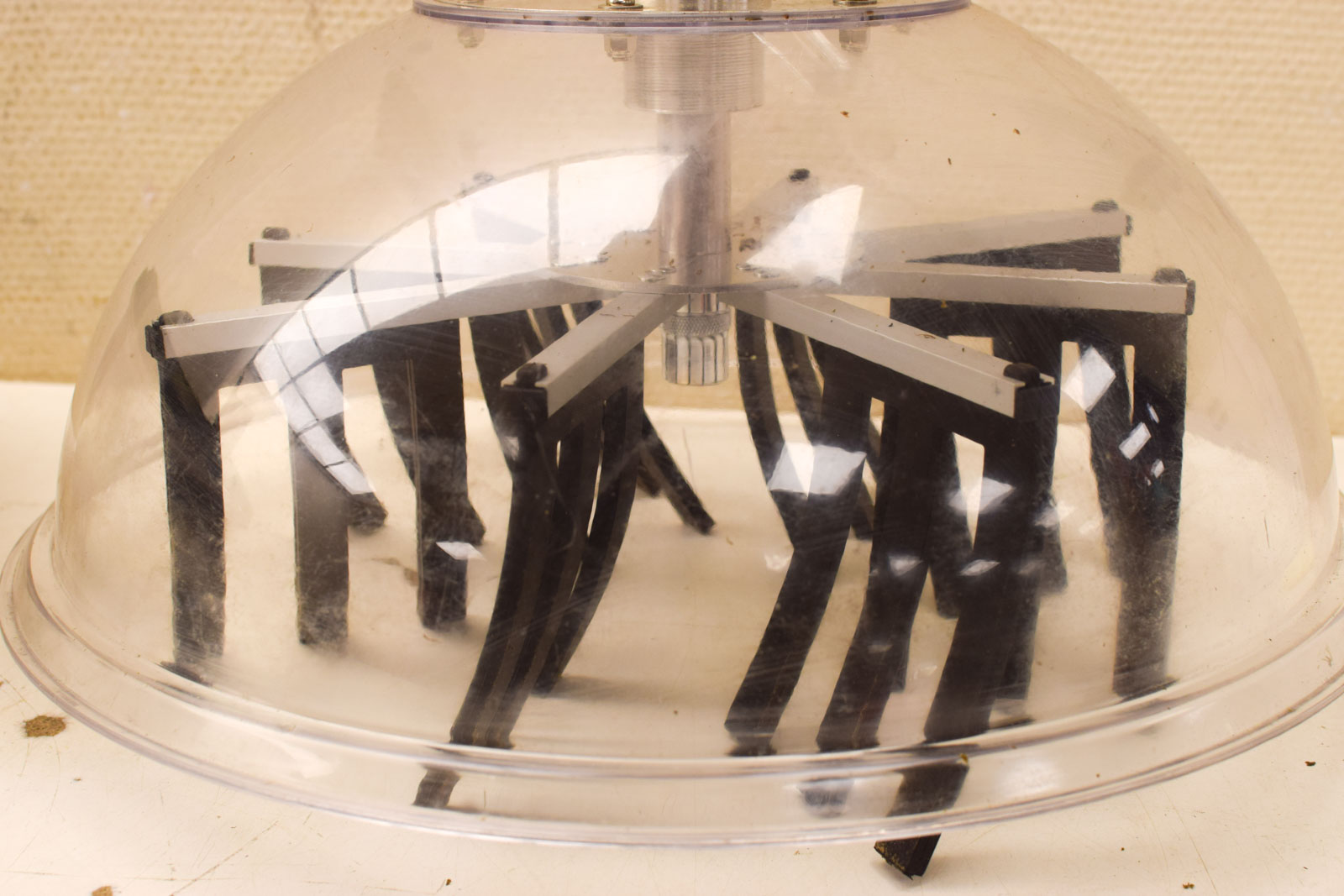 Dit is een interessant stuk: een grote platte porseleinen bord van ongeveer 30 cm breed en 3 cm hoog, maar wat je pas ziet bij nader inzien is dat het onderdeel uitmaakt van een completere opstelling. Het bevat een glazen klok (dome) met zwarte metalen montage en een draaibare onderkant, plus een zwarte porseleinen knop bovenop.