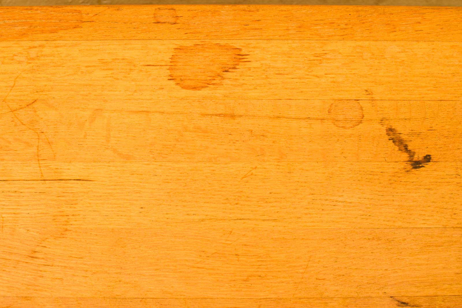 Het tafelblad vertoont duidelijke gebruikssporen: er zijn vlekken en krassen zichtbaar die wijzen op jaren van gebruik. Dit zijn normale tekenen van patina en dragen bij aan het karakter van het stuk. De constructie oogt stevig en stabiel.