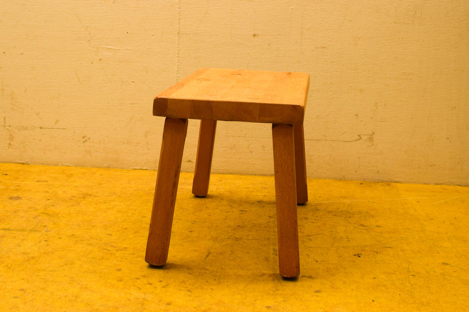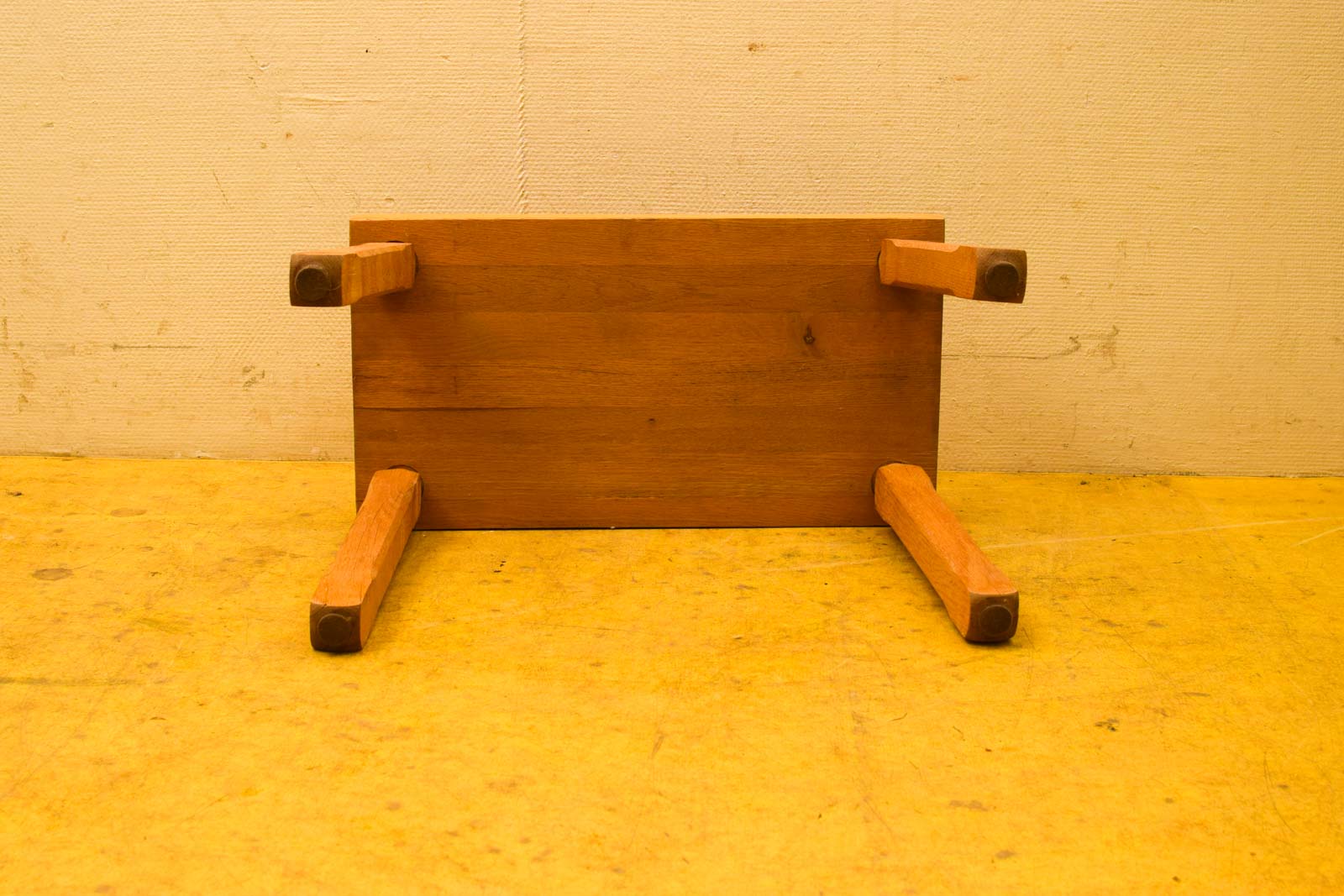 Dit houten bijzettafeltje is een compact meubel met een rechthoekig tafelblad op vier stevige houten poten. De breedte bedraagt 59,5 centimeter, de diepte 32 centimeter en de hoogte 39 centimeter, wat het geschikt maakt voor gebruik naast een bank, in een hoek of als kleine werktafel. Het hout heeft een warm, natuurlijke kleur die aan vintage design doet denken.