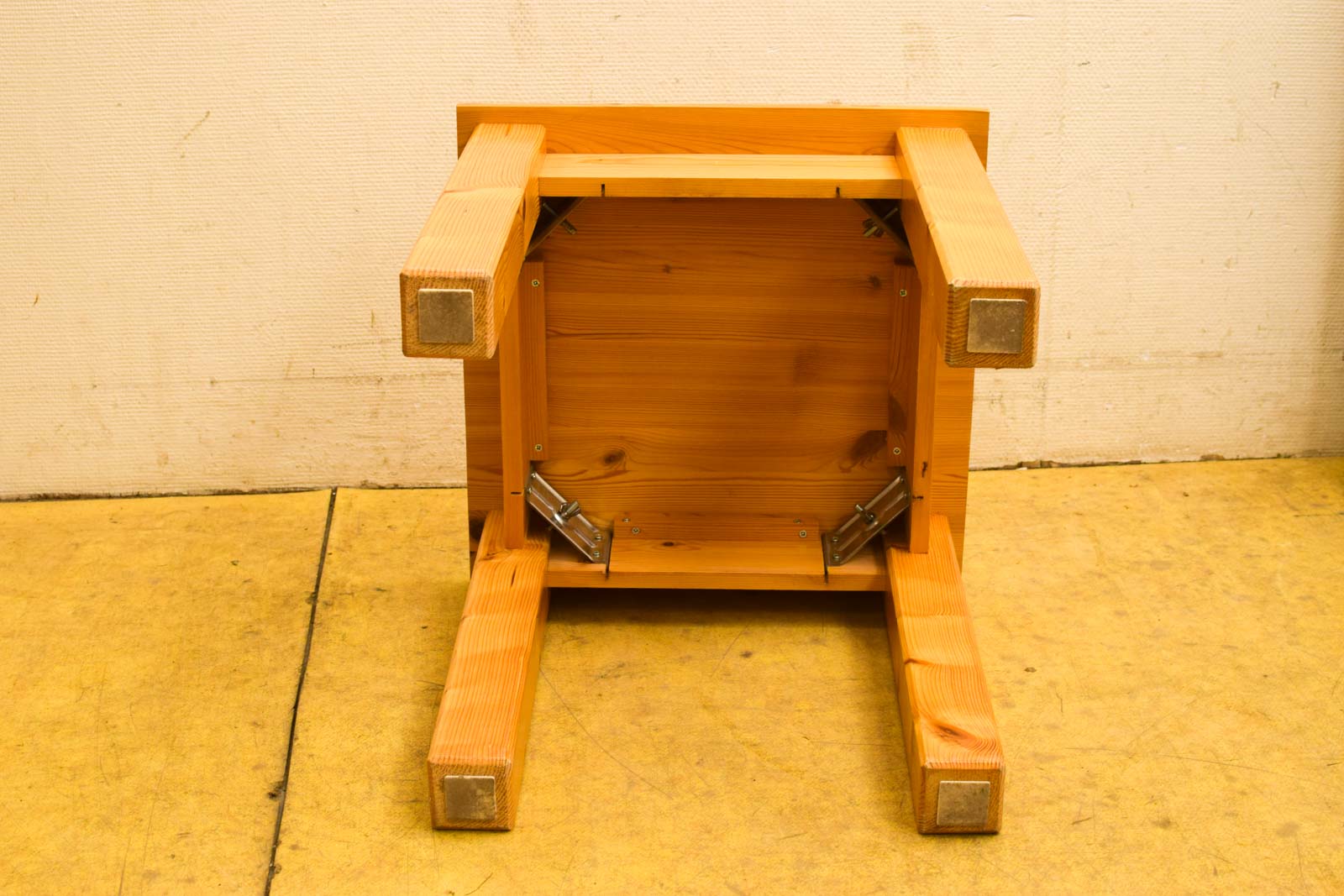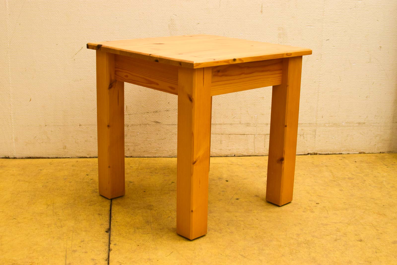 Het tafeltje is gemaakt van massief hout met een warme houtkleur. De constructie bestaat uit vier stevig uitgevoerde poten die voor stabiliteit zorgen. Aan de binnenkant zie je de bekasting en de verbindingsdetails. Het hout vertoont natuurlijke nerving en enkele kleine kerfjes en sporen van gebruik, maar is volledig intact en stabiel.