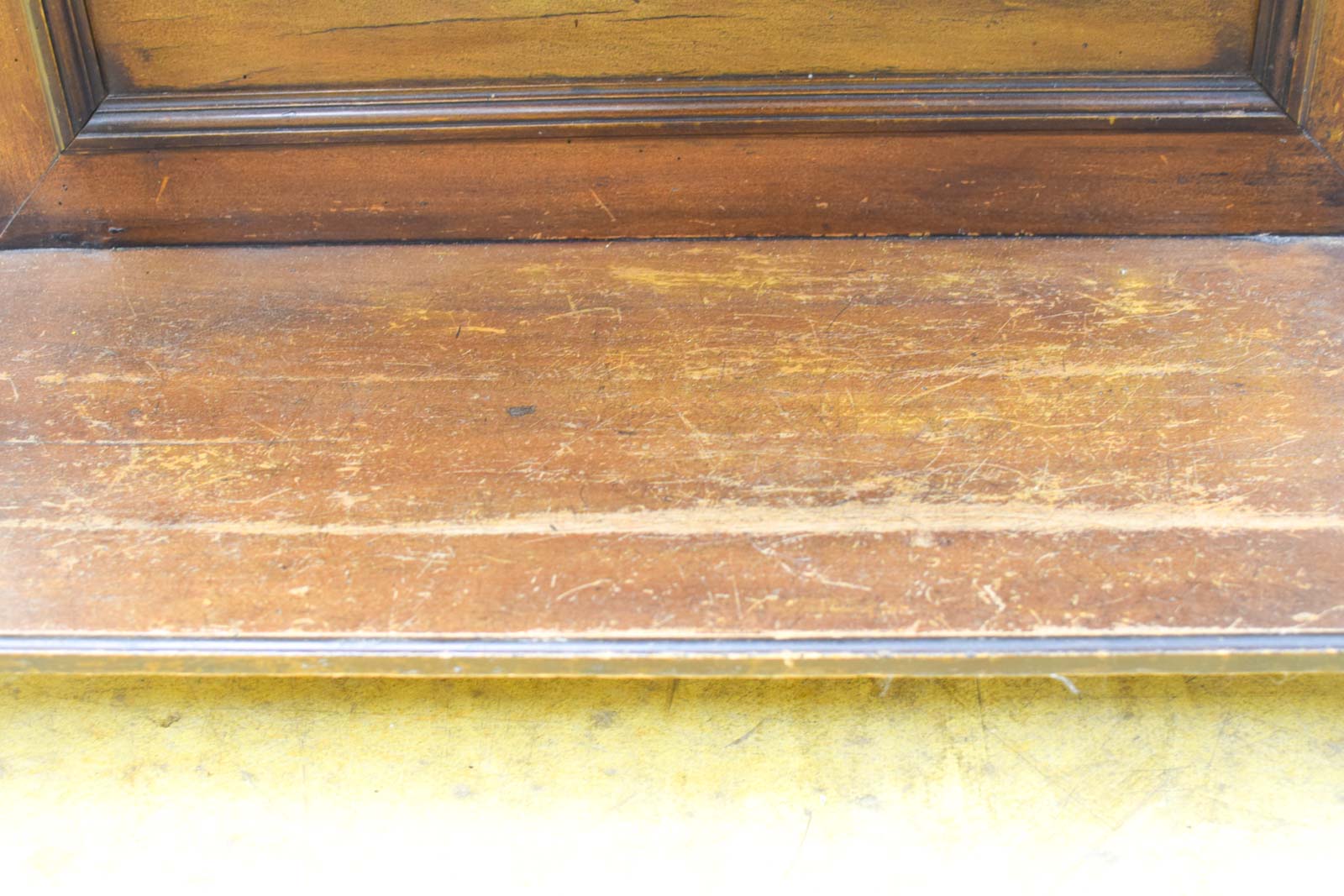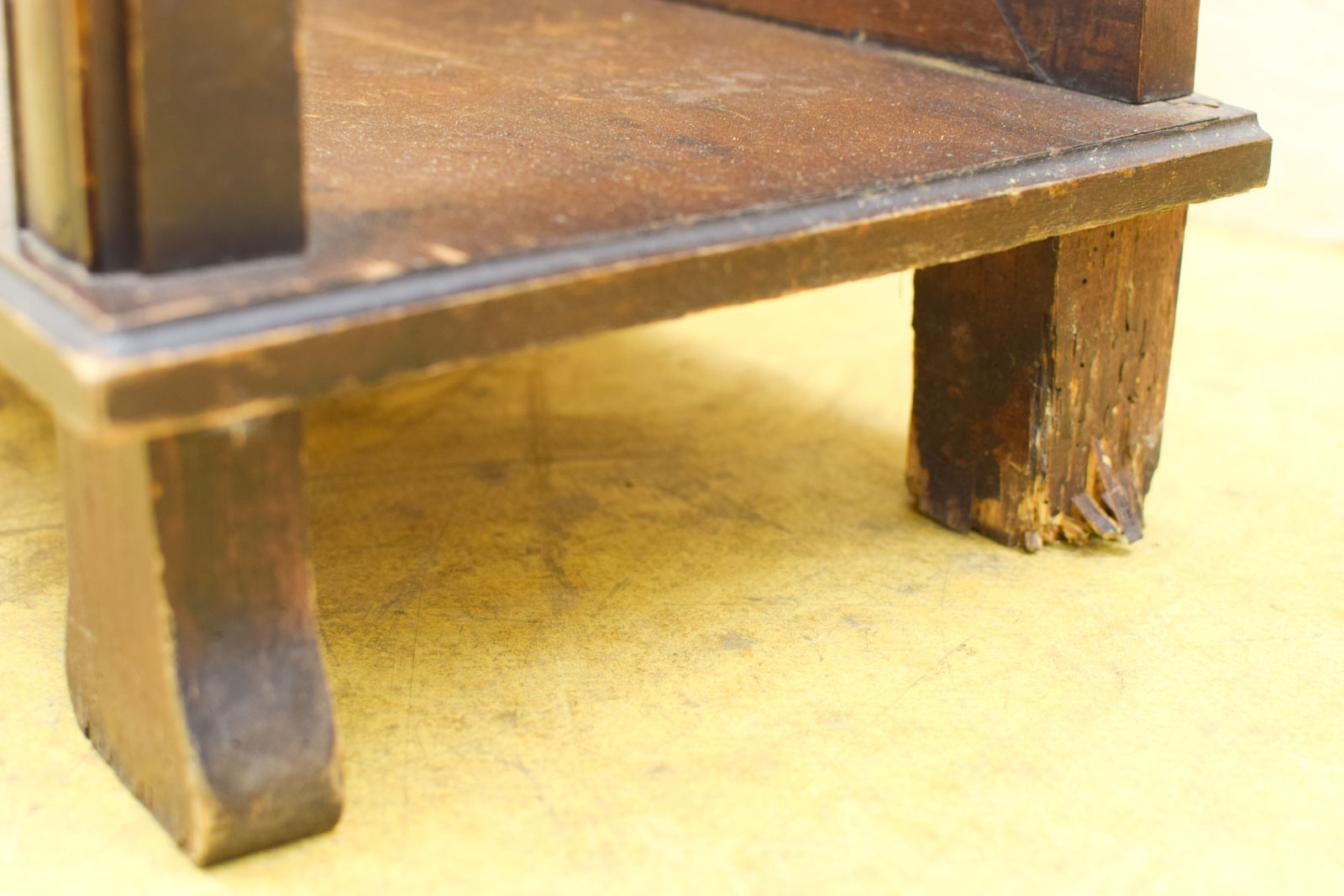 Het bijzettafeltje bestaat uit massief hout met stevige blokvoeten. Je ziet op de foto’s duidelijk de patina van jaren gebruik: oppervlaktekrassen, sporen van het dagelijks leven en variatie in de afwerking geven dit stuk karakter. De glasplaat ontbreekt, dus je hebt een open bovenkant met zichtbare houten onderstructuur.
