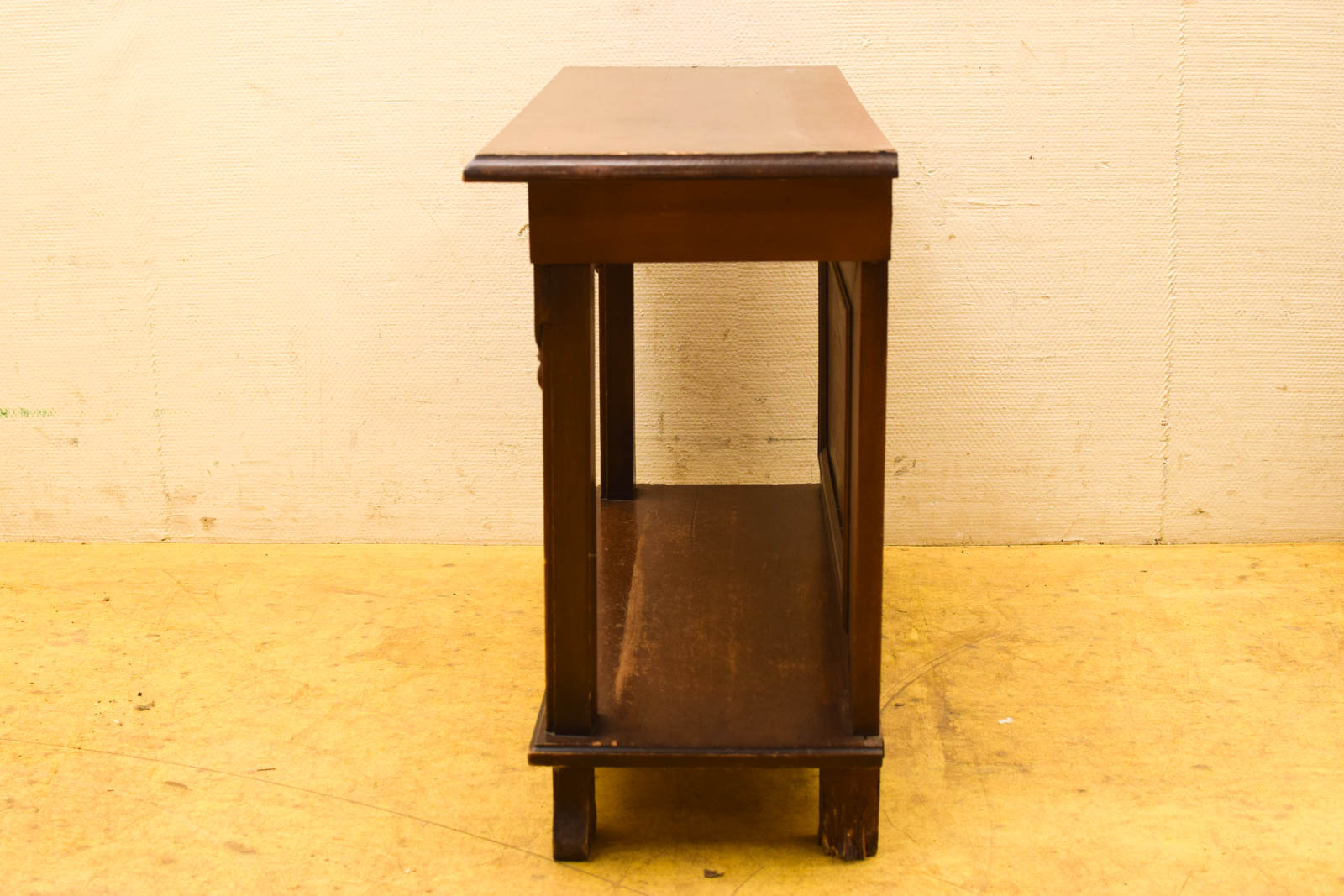 Dit houten bijzettafeltje heeft een charme uit een voorbij tijdperk. Met zijn afmetingen van 82,5 centimeter breedte, 31 centimeter diepte en 59 centimeter hoogte past het goed als accent in woonkamer of slaapkamer. Het tafelblad is voorzien van een donkere afwerking, terwijl de zijkanten mooie gesneden details en ingelegd decor hebben die wijzen op handwerk uit de klassieke meubelbouw.